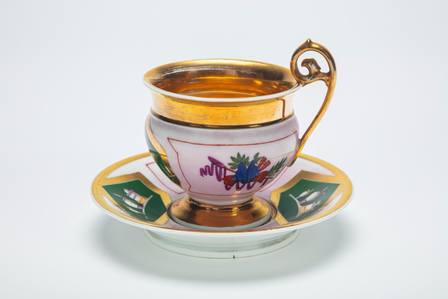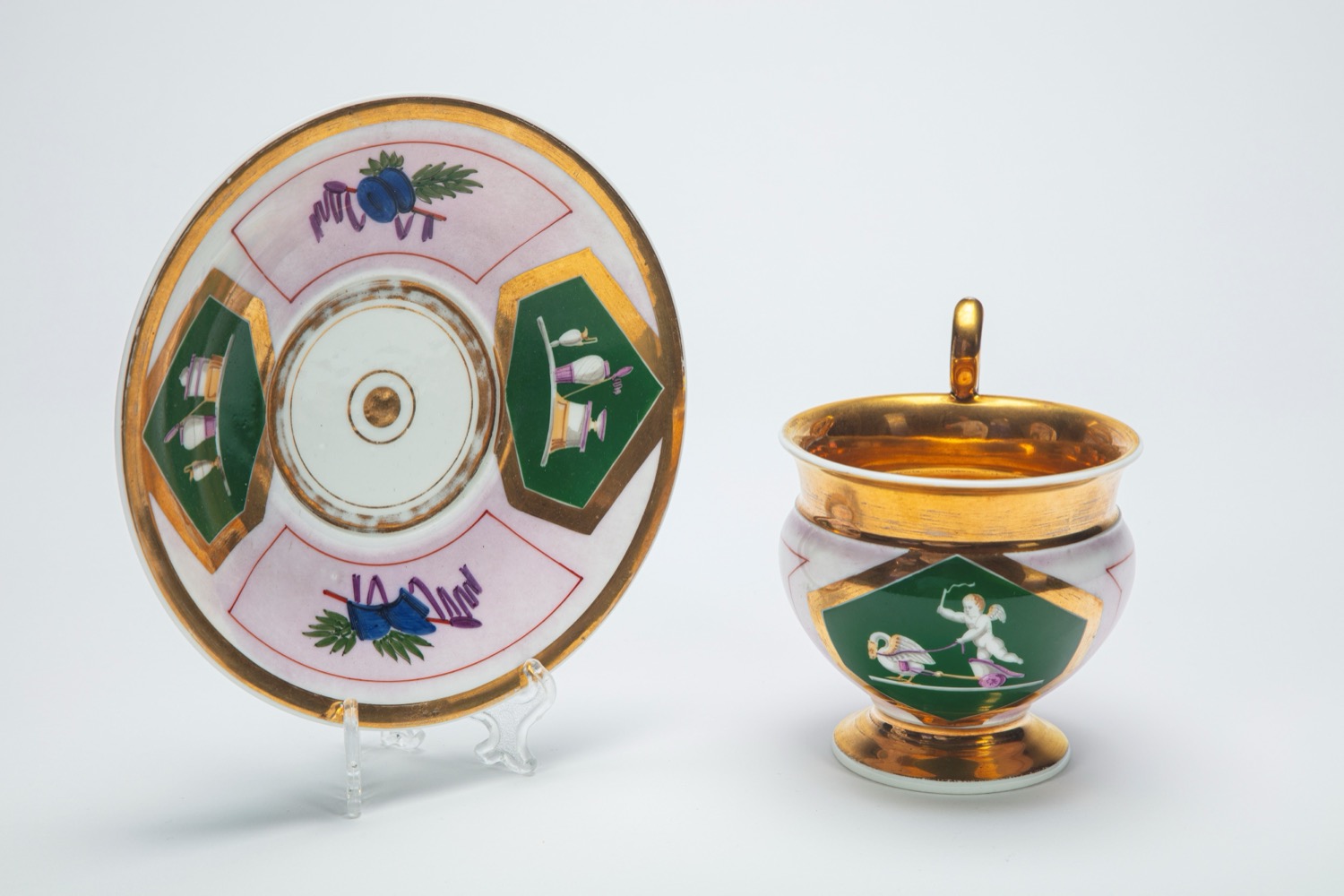 porcellana dipinta in policromia e oro a trofei entro riserve rosa e con losanghe verdi centrate da vasi e da amorino alato su biga trainata da cignoporcellana dipinta in policromia e oro a trofei entro riserve rosa e con losanghe verdi centrate da vasi e da amorino alato su biga trainata da cigno