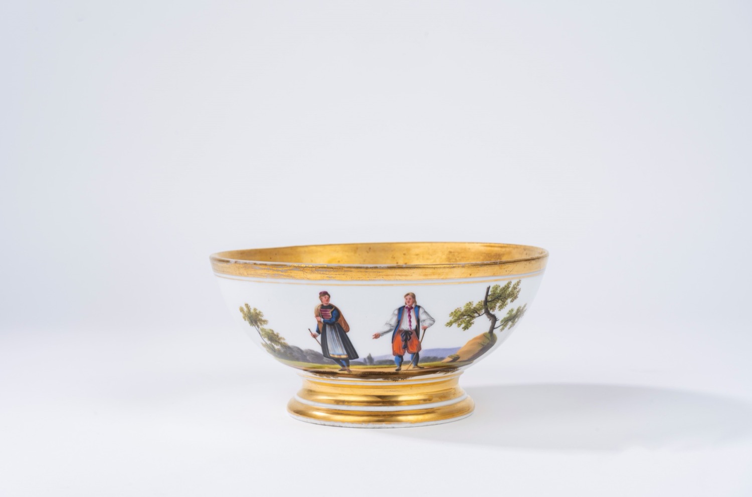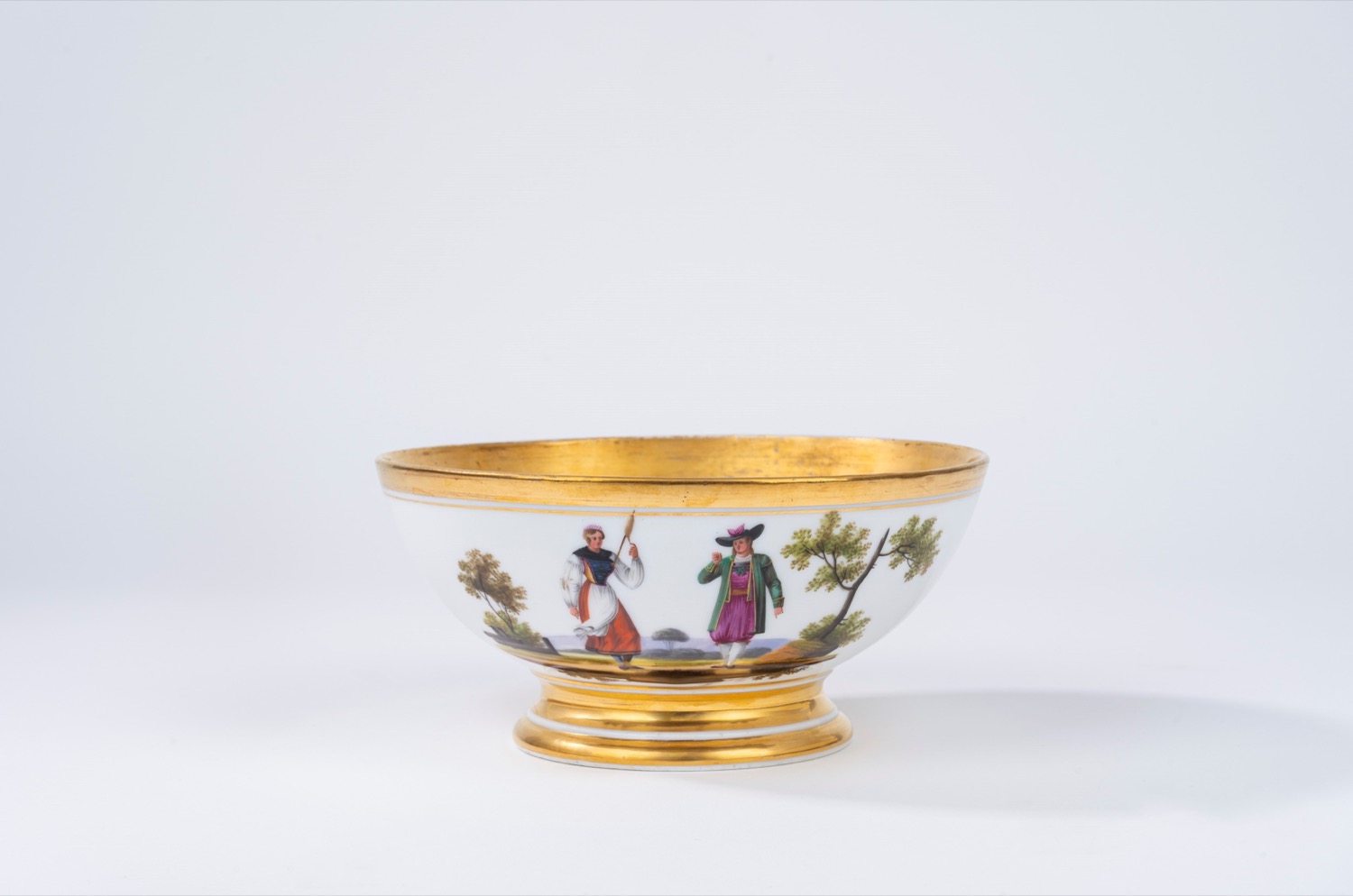 Lotto 575 | Ciotola in porcellana bianca e dorata decorata in policromia a figure in costume in paesaggi, Francia secolo XIX