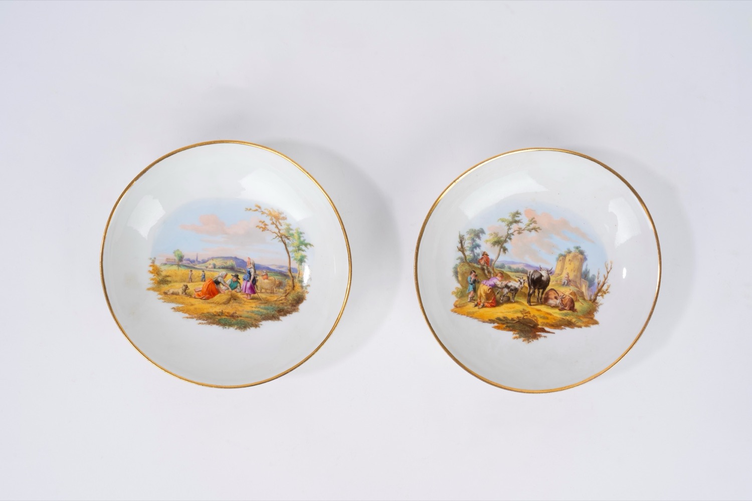 Marchio a spade incrociate sotto la basedecorate con paesaggi, pastori e armenti nello stile di Nicholaes Berchem.