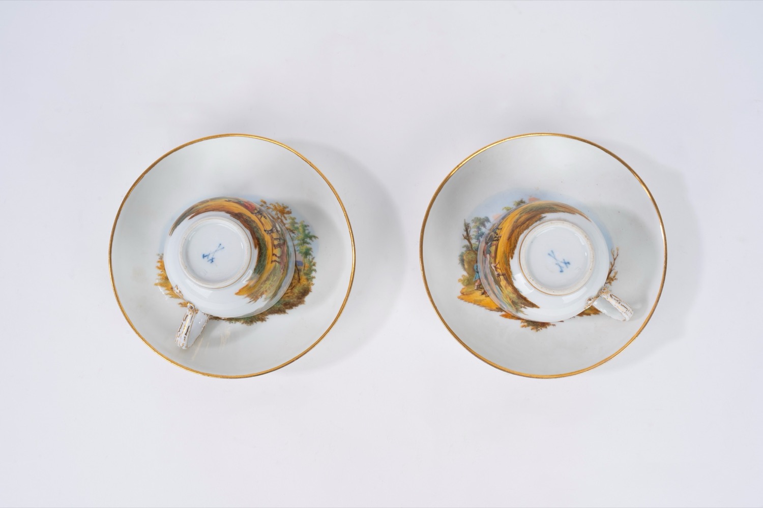 Coppia di tazzine in porcellana policroma con piattino, Meissen secolo XIX