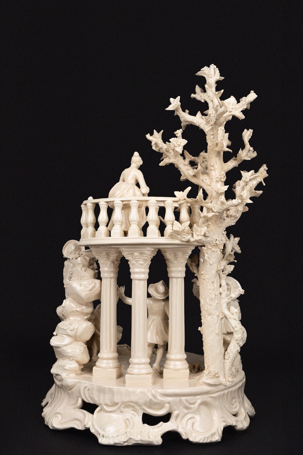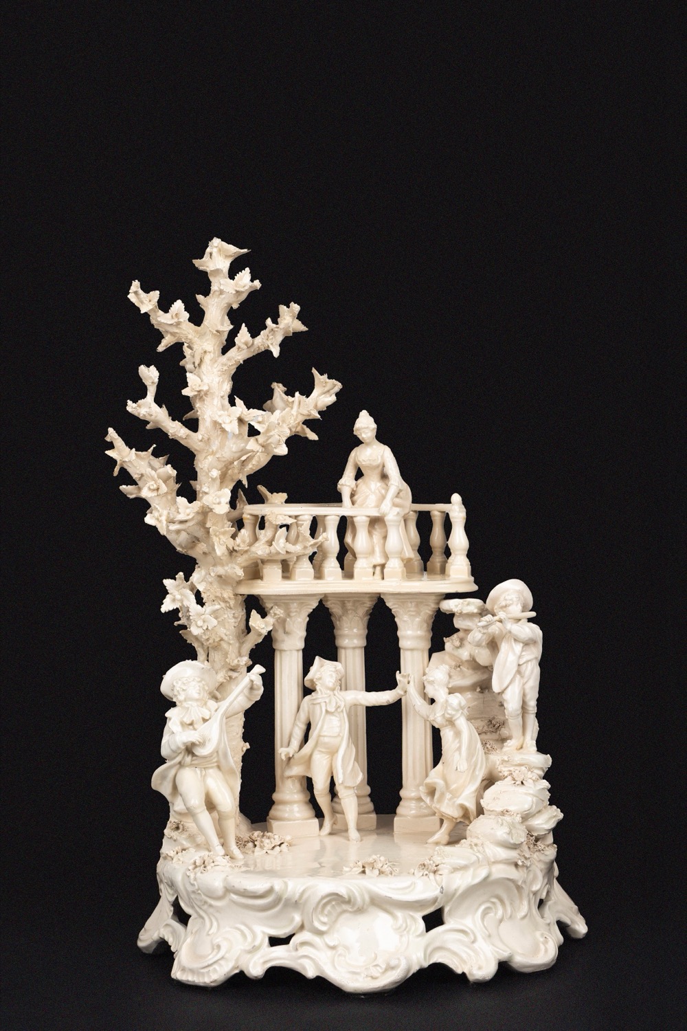 con figure danzanti e suonatori in un'ambientazione architettonica a portico con tre colonne corinzie scanalate tra un'albero con rami fioriti e rocce con fili d'erba, foglie e fiori, su una base a rocaille. Marca sotto la base