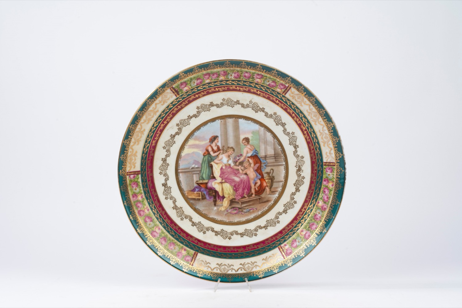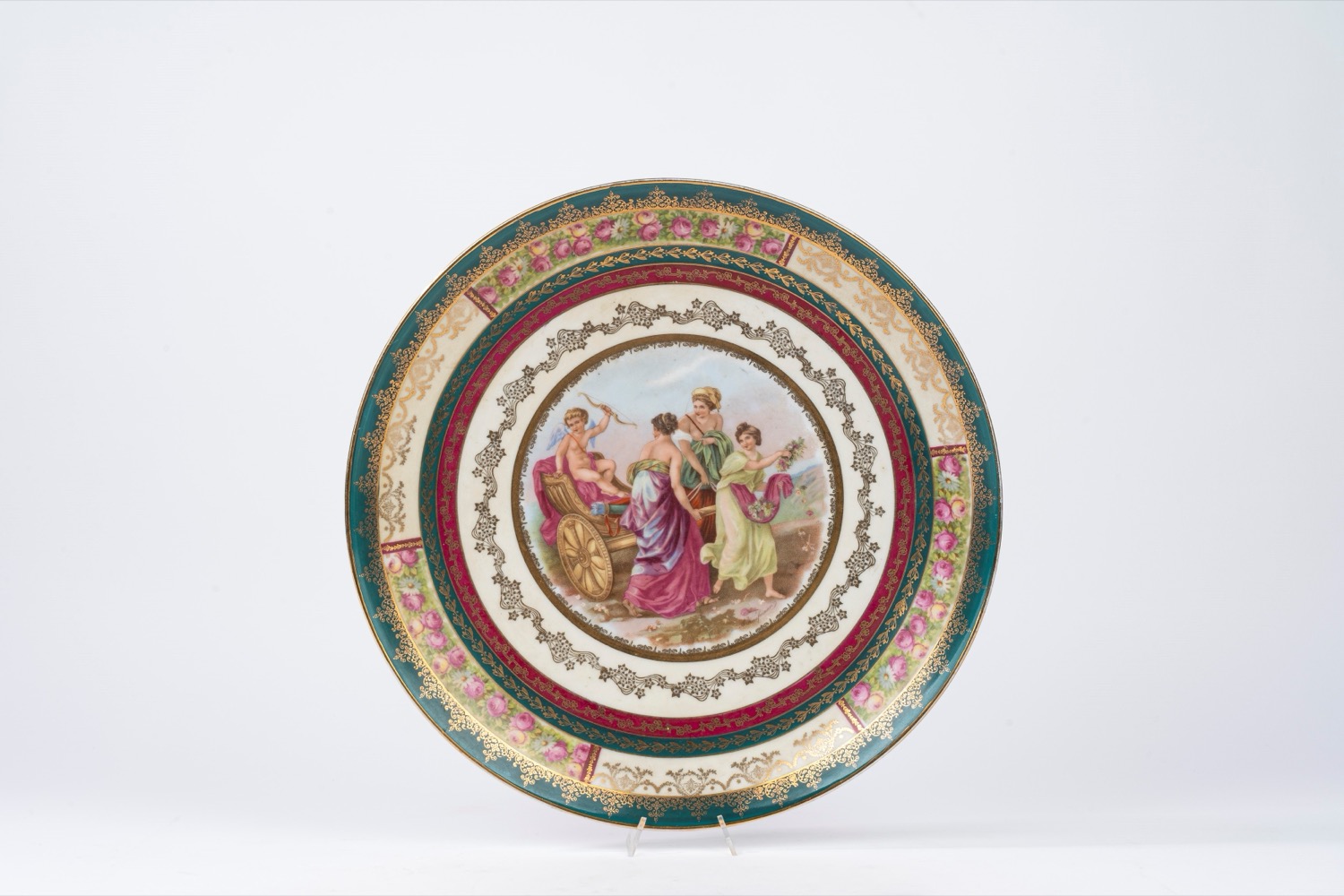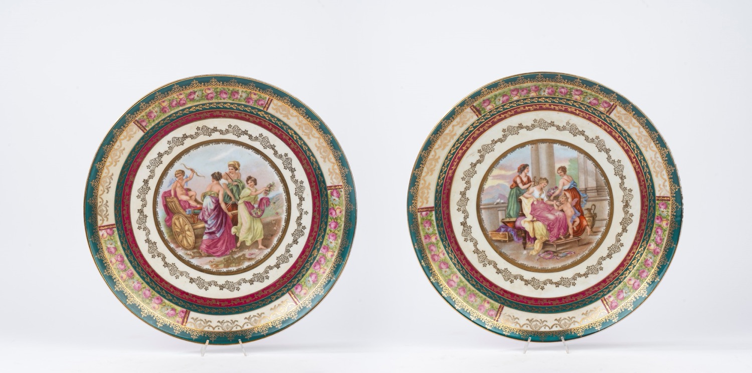 decorati nel cavetto uno con il carro dell'Amore e l'altro con toeletta di Venere, da composizioni di Angelica Kauffmann; nella tesa con motivi floreali e motivi ad arabesco in oro.