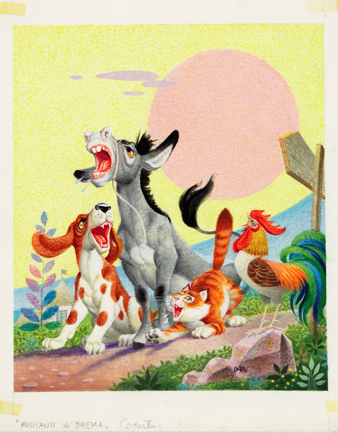 Illustrazione originale realizzata da Baraldi per la fiaba "I musicanti di Brema" edita nel 1982. Firmata.