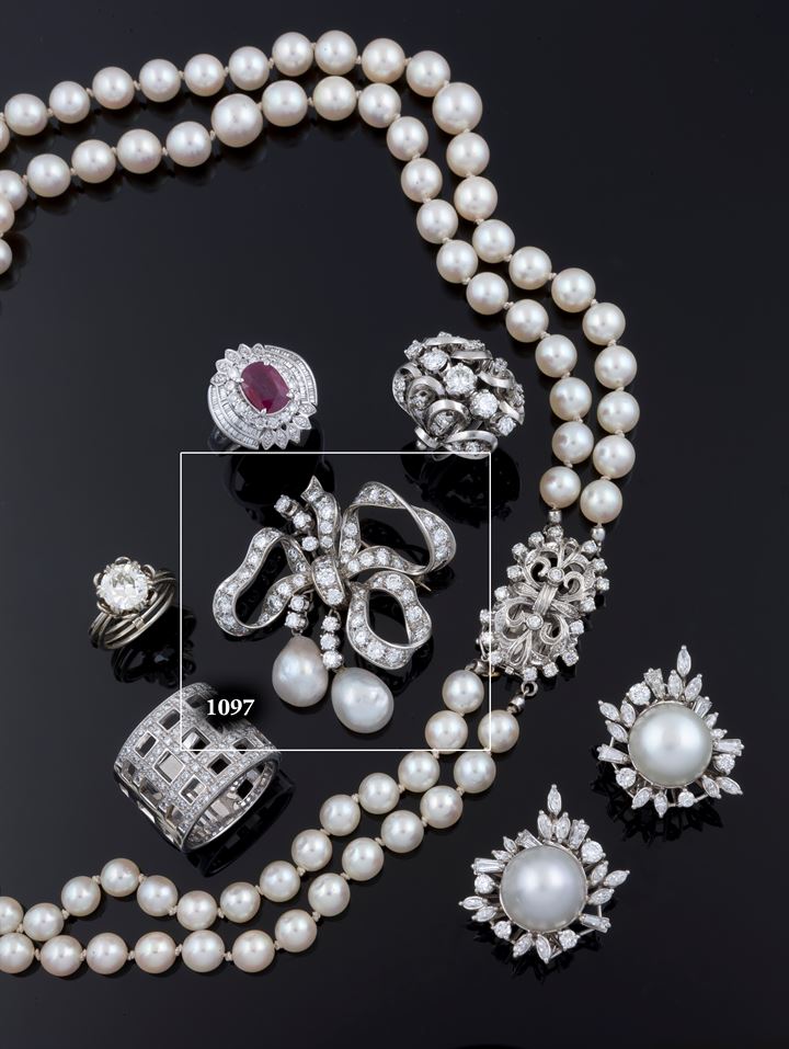 In oro bianco a forma di fiocco, con diamanti taglio brillante per complessivi ct 3,20 ca e due perle a pera pendenti