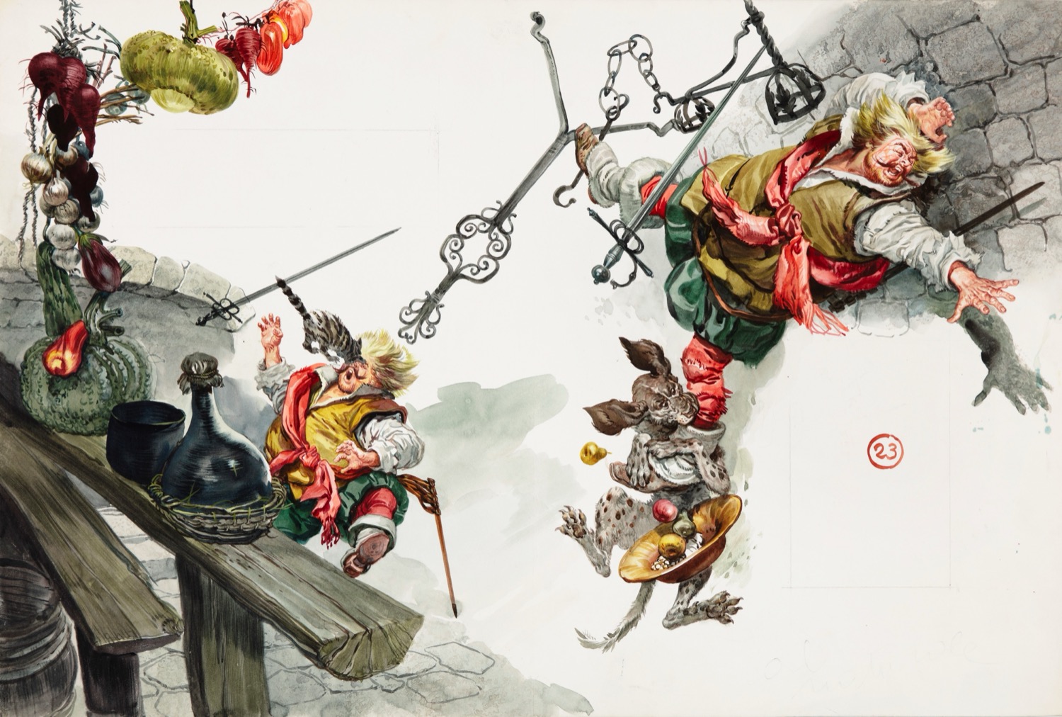 Illustrazione originale realizzata da Ferri per la fiaba "I musicanti di Brema" edita nel 1967.