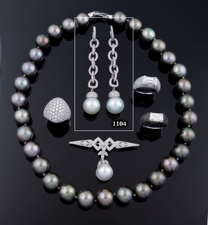 Coppia di orecchini pendenti in oro bianco: elemento a lobo a forma di cerchio, corpo ad anelli intrecciati in diamanti taglio brillante e 8/8 per complessivi ct 1,30 ca, terminanti con due perle australiane del diam di mm 14,0 e 14,6