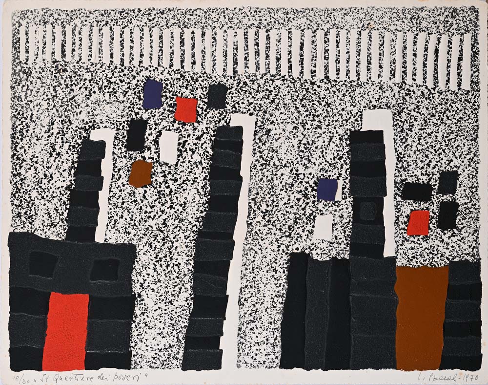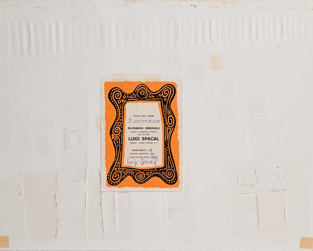 Il quartiere dei poveri 1970 Firma, data, titolo e numerazione "l Spacal 1970, Il uartiere dei poveri, 18/30". Al verso reca etichetta Luigi Spacal Trieste Piazza Venezia 4 firmata dall'autore Acquaforte/acquatinta - Xilografia cm 43x54