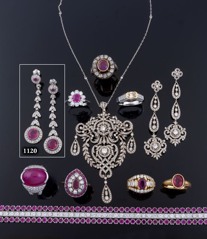 con diamanti taglio brillante per complessivi ct 1,0 ca terminanti con rubini taglio rotondo