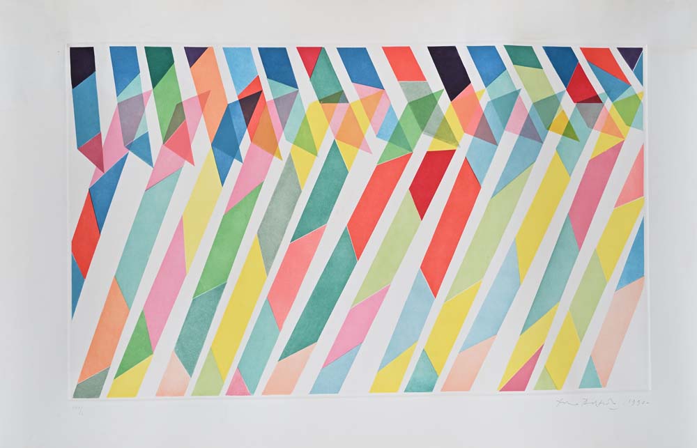 Composizione 1990 Firma, data e numerazione "Piero Dorazio 1990, XXIX/L". Timbro a secco e ad inchiostro (al retro) della Grafica Lombardi, Roma Acquatinta cm 80x120