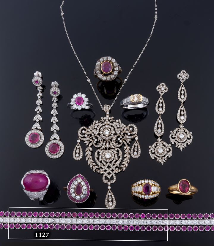 In oro bianco composto da due file di rubini taglio rotondo intervallate da fila centrale di diamanti taglio brillante per complessivi ct 4,50 ca