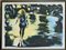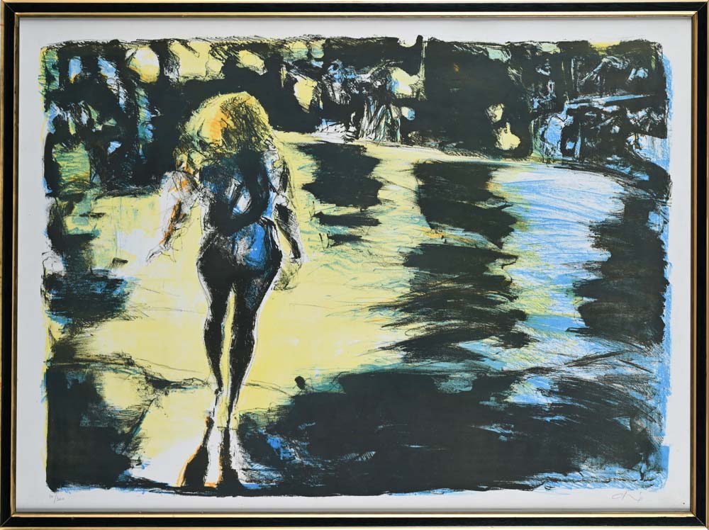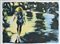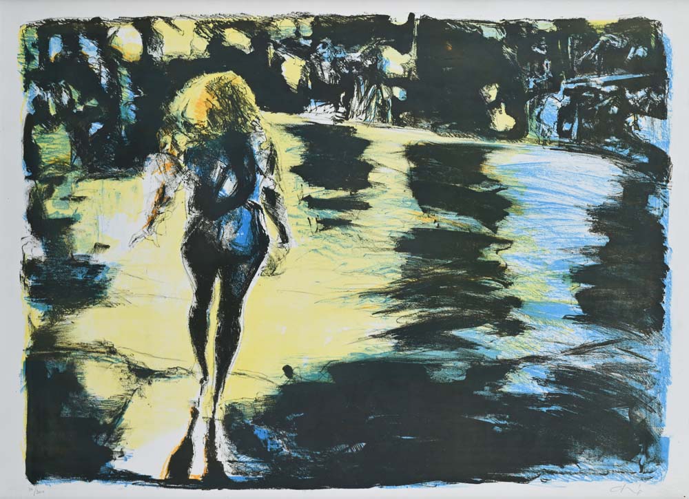 Donna sulla spiaggia Firma e numerazione "Calabria 10/300". TImbro a secco dello stampatore L'acquaforte Litografia a 5 colori cm 56x76 - in cornice 59x79