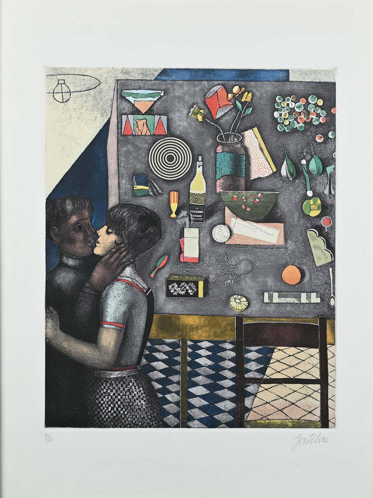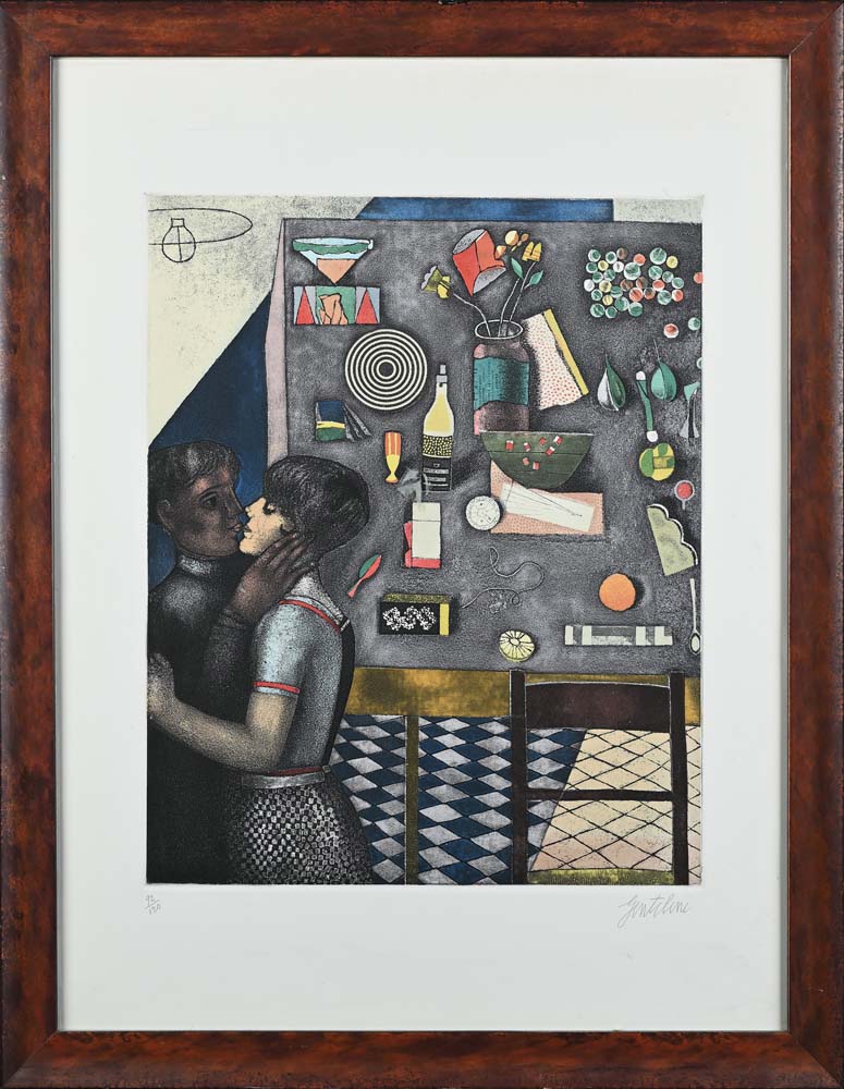 Amanti al tavolo apparecchiato Firma e numerazione "Gentilini 92/120" Acquaforte/acquatinta cm 80x60 - in cornice cm 88x68