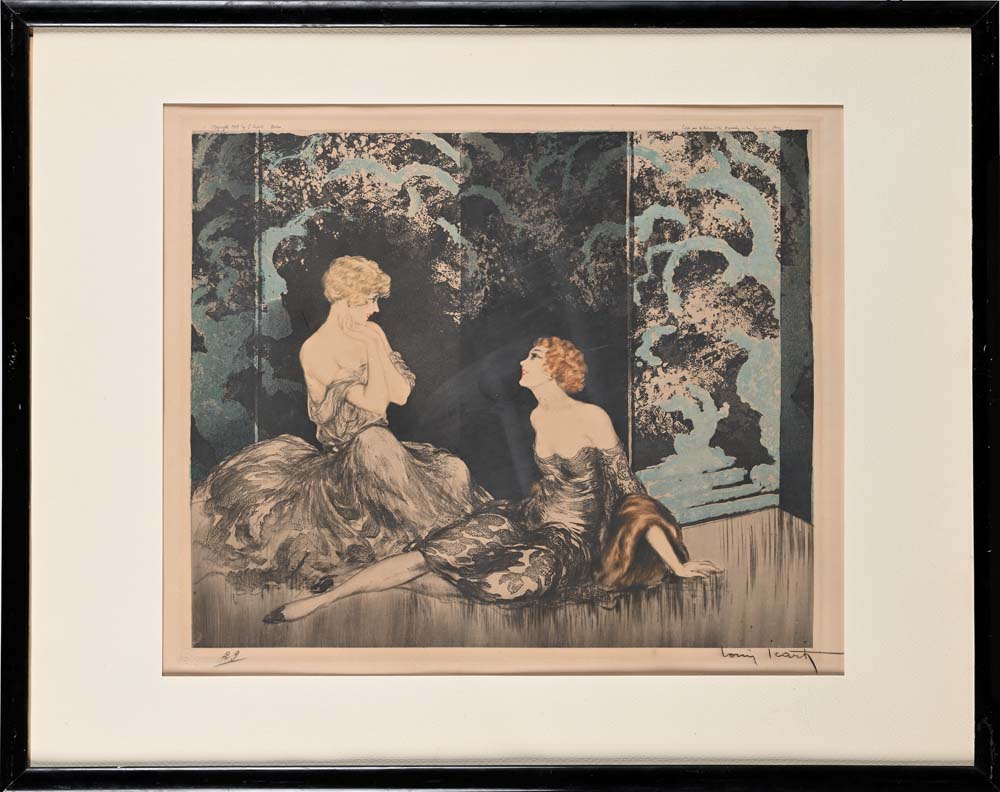 Senza titolo (Il Pettegolezzo) Firma a matita "Louis Icart"; in basso a sinistra reca numero 29; timbro a secco dello stampatore in basso a sinistra; in alto, in lastra, indicazioni dell'edizione di copyright Grafica lastra cm 40,5x47,5 - in cornice cm 58x73