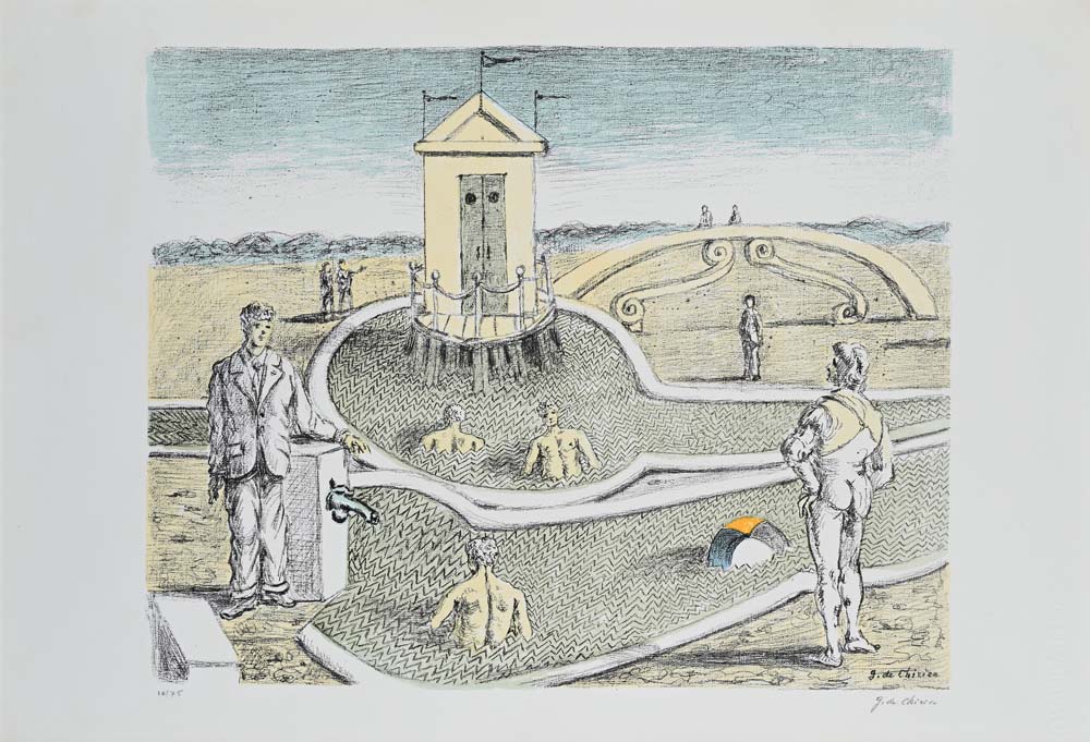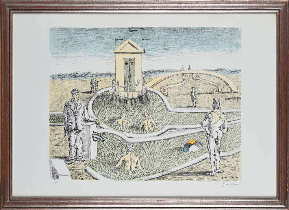 La cabina nei bagni misteriori Firma e numerazione "G.De Chirico 10/75". In basso a sinistra timbro a secco "Galleria La Medusa Roma" Litografia cm 50x70 - in cornice cm 56x76