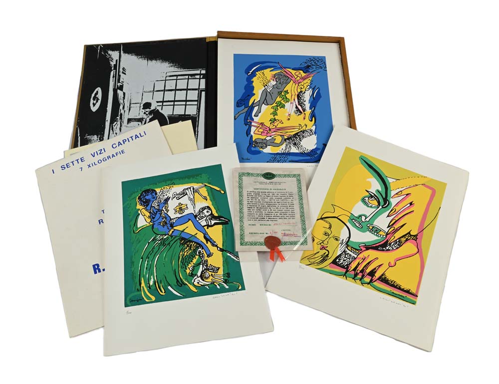 I sette vizi capitali 1981 Cartella completa delle 7 xilografie eseguite nel 1981 da Remo Brindisi e realizzate dalla Maxart Serigrafica Editore Milano, completa di custoria in cartone rigido. Ogni xilografia misura cm 47x33 ed è firmata e numerata Brindisi 3/100 e, in lastra, presenta il titolo relativo al vizio capitale. Completa di Colophon numerato 3/100 e di certificato di garanzia con timbro in ceralacca dell'amministratore Maxart Cartella di 7 Xilografie