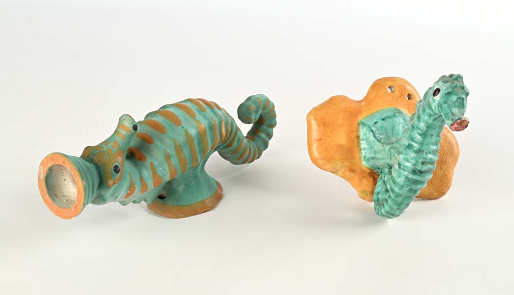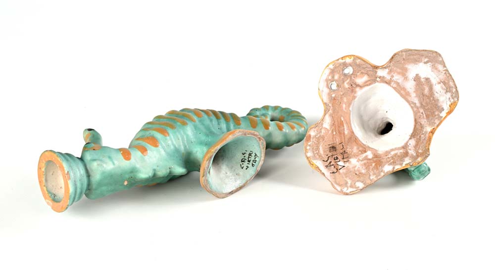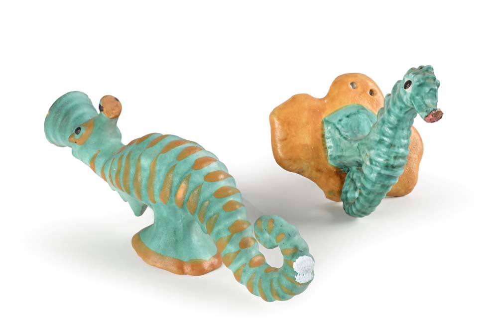 Lotto di un candeliere ed un attaccapanni a forma di cavalluccio marino Le due sculture, realizzate in ceramica dipinta e smaltata, misurano cm h 30x6x9 e 14x16x19. Entrambe sono firmate al verso "C.A.S. Vietri, Italy".