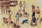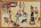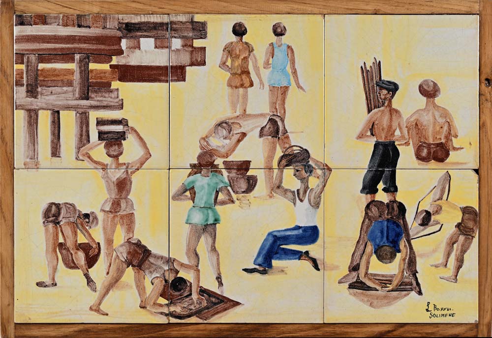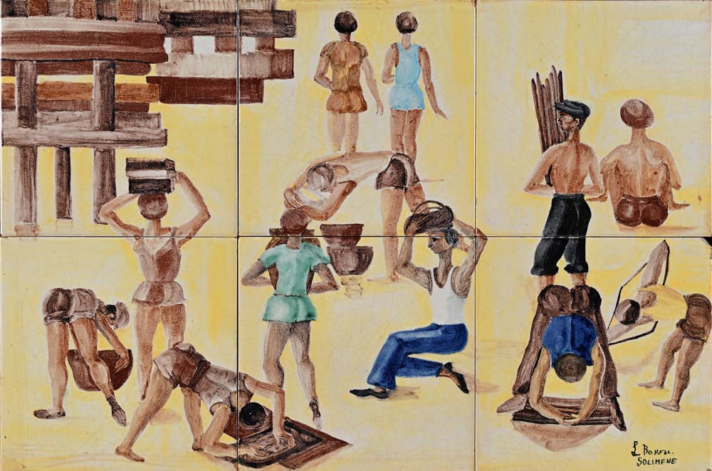 Sulla spiaggia, Manifattura Liliana Bove Solimene 1962 Firma e data in basso a destra "L. Bove 62, SOlimene" Pannello di 6 mattonelle in ceramica maiolicata policroma su tavola cm 40x60 - in cornice cm 44x64