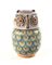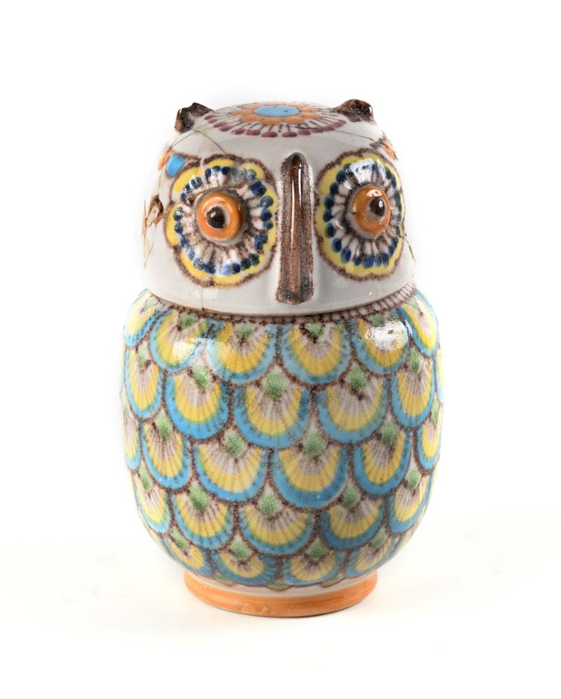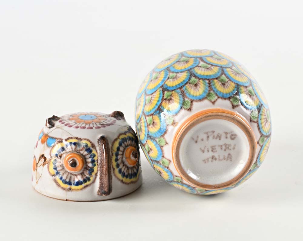 Piccolo vasetto in ceramica smaltata policroma, manifattura Pinto Vietri sul Mare A forma di gufo, con coperchio estraibile, questo delizioso vasetto è decorato finemente nei toni dell'azzurro, del giallo, del rosso e dell'arancio. Sotto la base reca firma "V. Pinto, Vietri, Italia". Difetti cm h 15