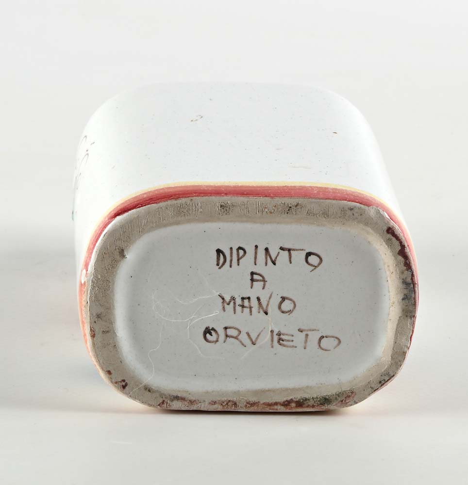 Lotto di una boccetta, una maschera ed un asinello in ceramica smaltata dipinta L'asinello misura cm h 32, la maschera misura cm 17x17 ed è firmata "G. Martello", la boccetta misura cm h 14 ed è inscritta "Dipinto a mano Orvieto"