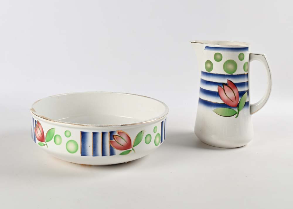 Servizio da Toeletta, Digoin France Il versatoio misura cm h 28, il recipiente cm 34 Ø. Sotto la base sono entrambe marchiate "Digoin France" Ceramica smaltata dipinta