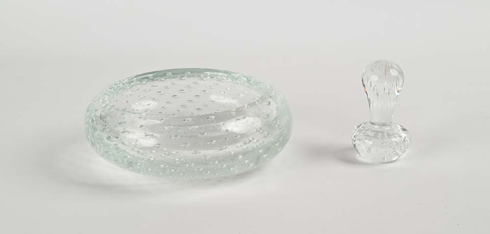 () Posacenere e pestello in vetro pesante incolore con inclusioni di bolle cm...