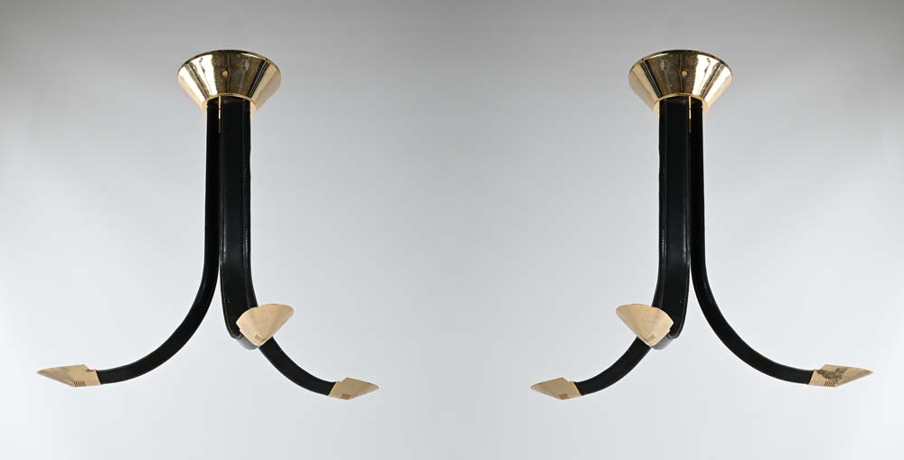Coppia di lampadari a tre luci prod. Comelit Struttura in metallo dorato e cuoio Etichetta del produttore cm h 66x75 Ø circa l'uno
