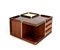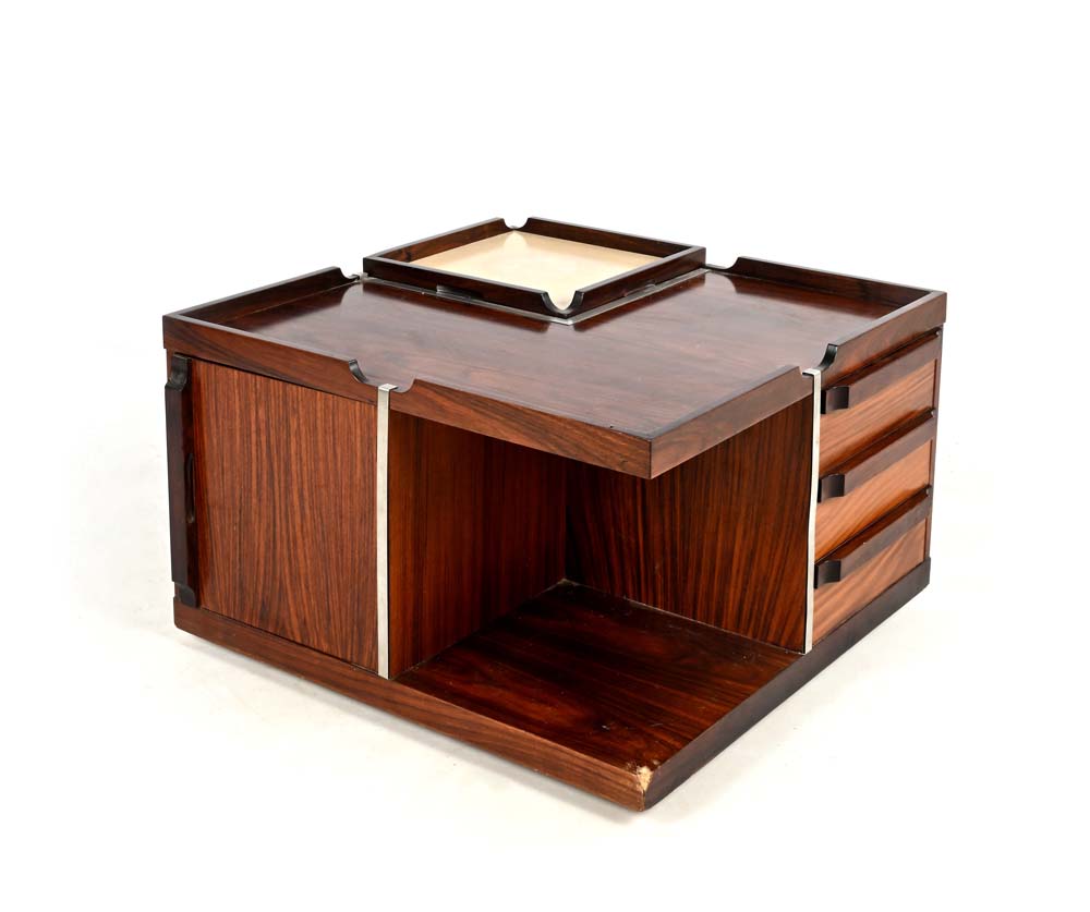 Tavolino da salotto Delizioso tavolino basso da salotto in legno con finiture in metallo. Poggia su 4 ruote che ne permottono il facile spostamento, con tre cassetti estraibili e sul piano un pratico vassoio sollevabile che sotto da accesso ad un porta ghiaccio o porta bottiglie cm h 45x73x73