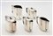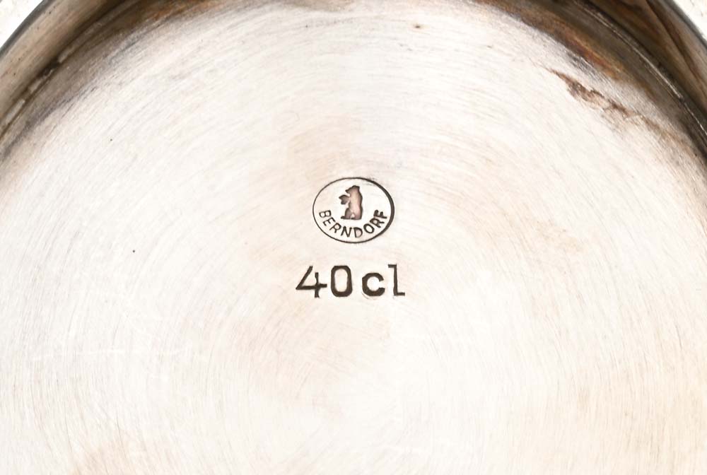 Servizio da caffè e thé mod. 49500 prod. Berndorf, Austria Servizio composto da 5 teiere di forma ovale in metallo argentato, ognuna reca sotto la base il marchio "Berndorf". La più grande misura cm h 13x18x8 e contiene 75 cl, le due più piccole cm h 9x12x5,5 e contengono 20 cl.