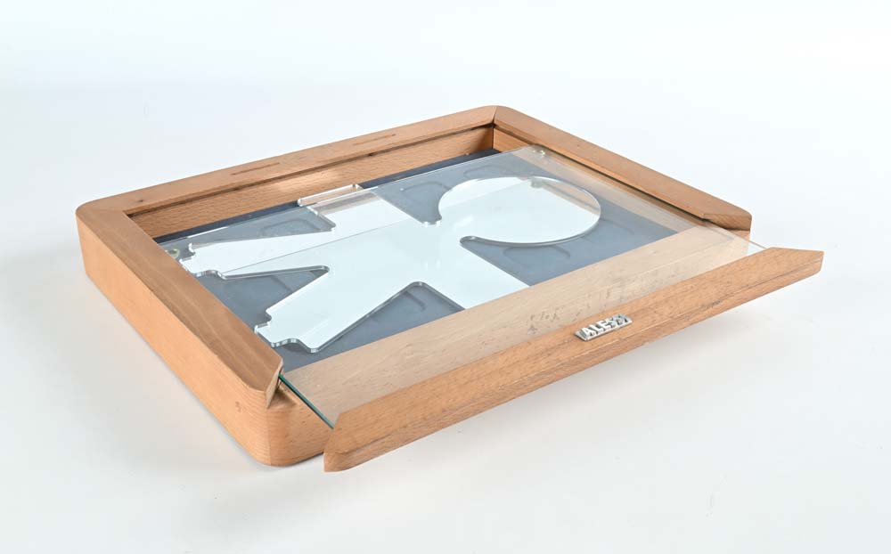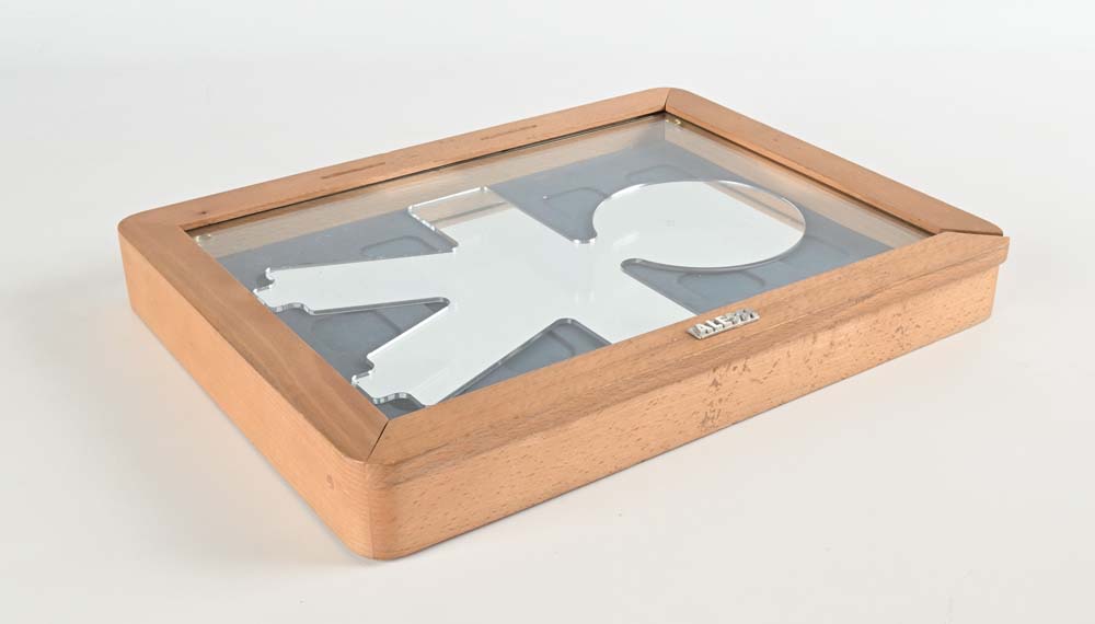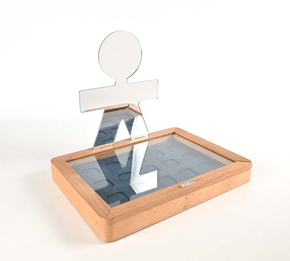 Specchiera dalla serie Girotondo, produzione Alessi Specchio entro scatola in legno con sportello estraibile Marchio del produttore "Alessi" cm 40x30x5