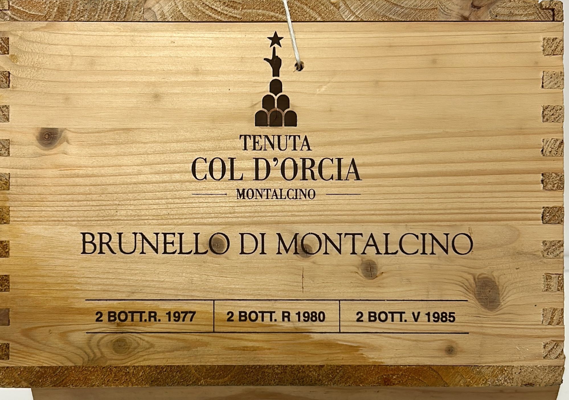 Lotto composto da 6 bottiglie da 75 cl. di BRUNELLO DI MONTALCINO COL D'ORCIA - ANNATE STORICHE: 2 bottiglie anno 1977, 2 bottiglie anno 1980, 2 bottiglie anno 1985.