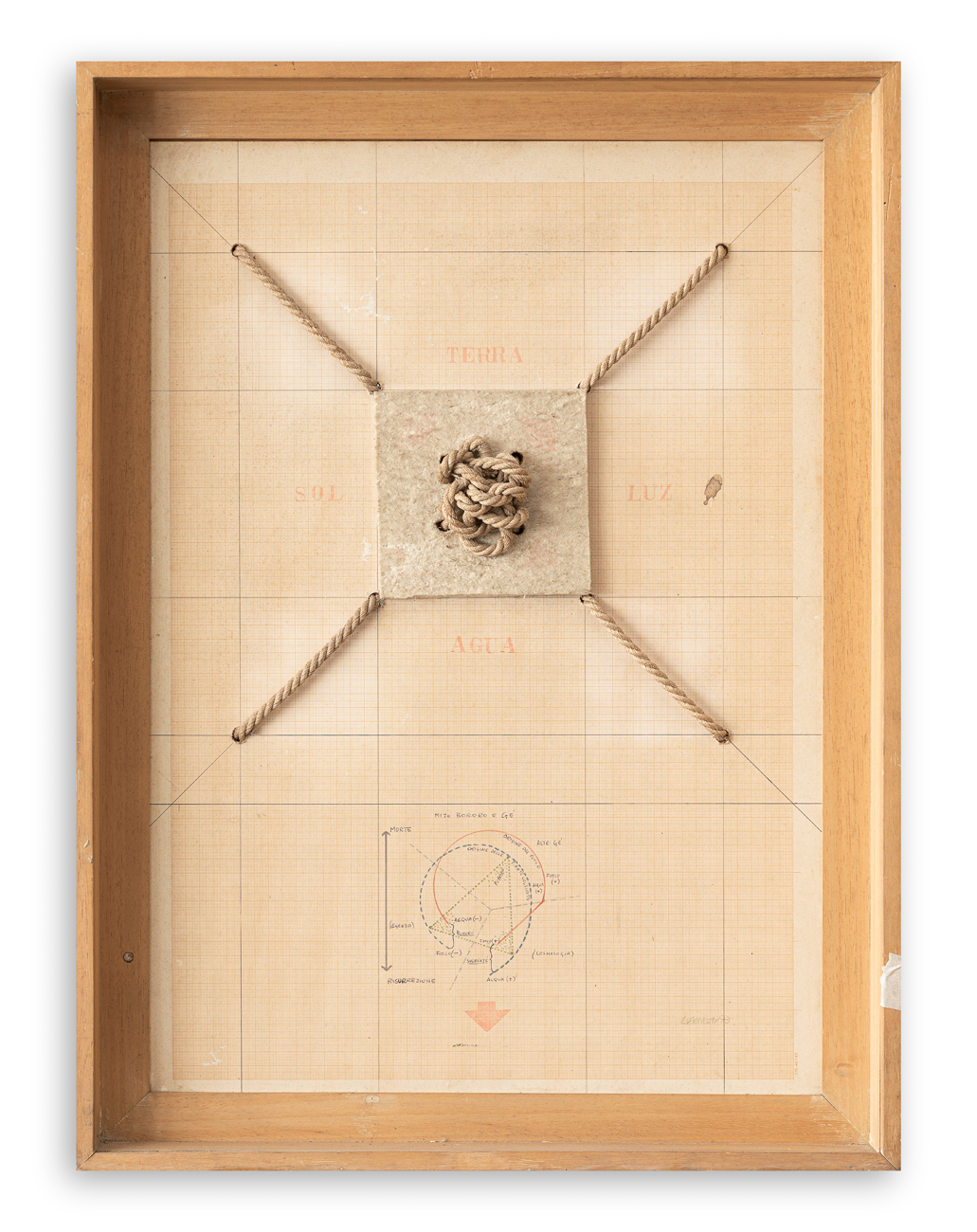 Tecnica mista su carta su carta millimetrata serigrafata, applicazione di corde e feltro, entro cassetta in legno
