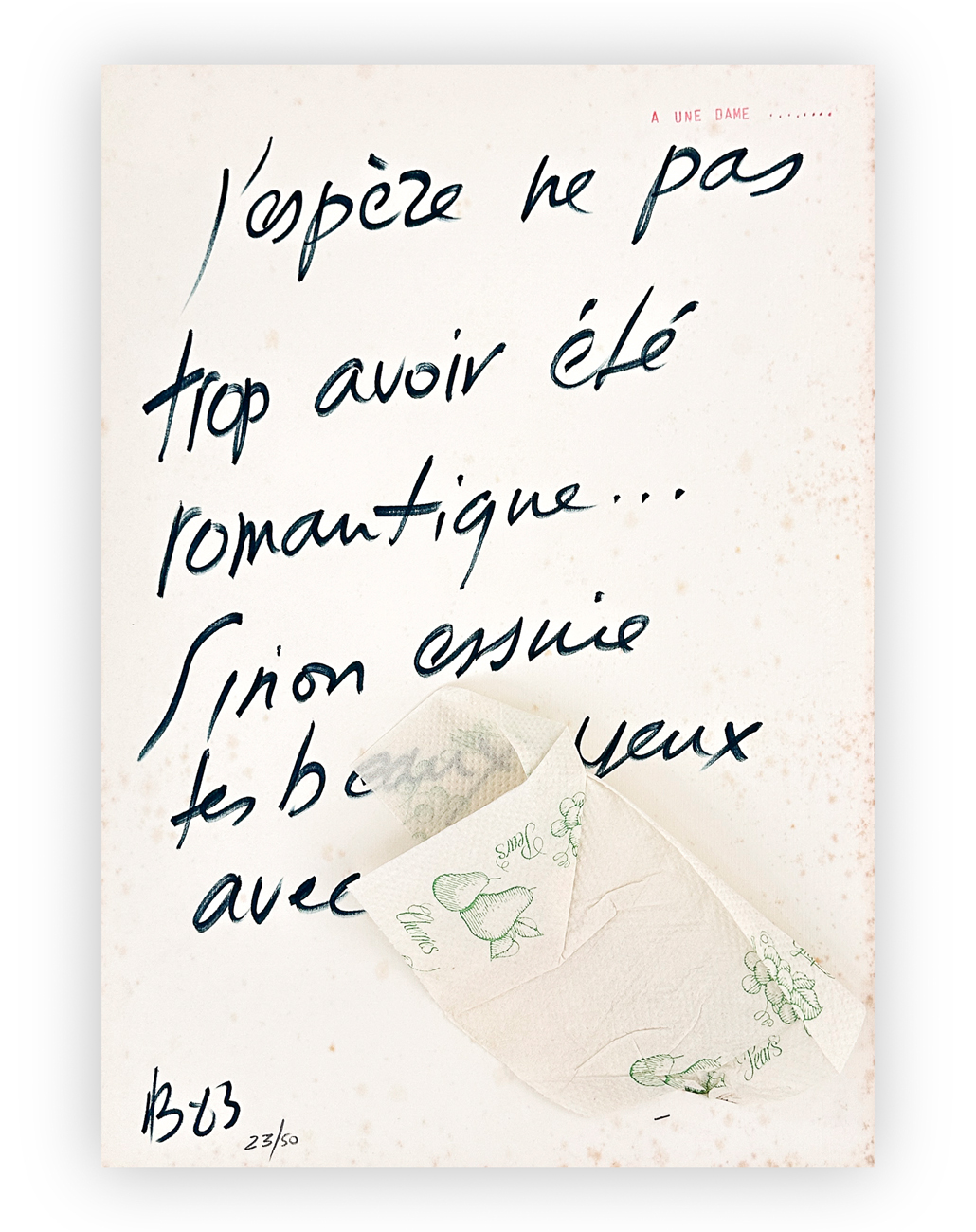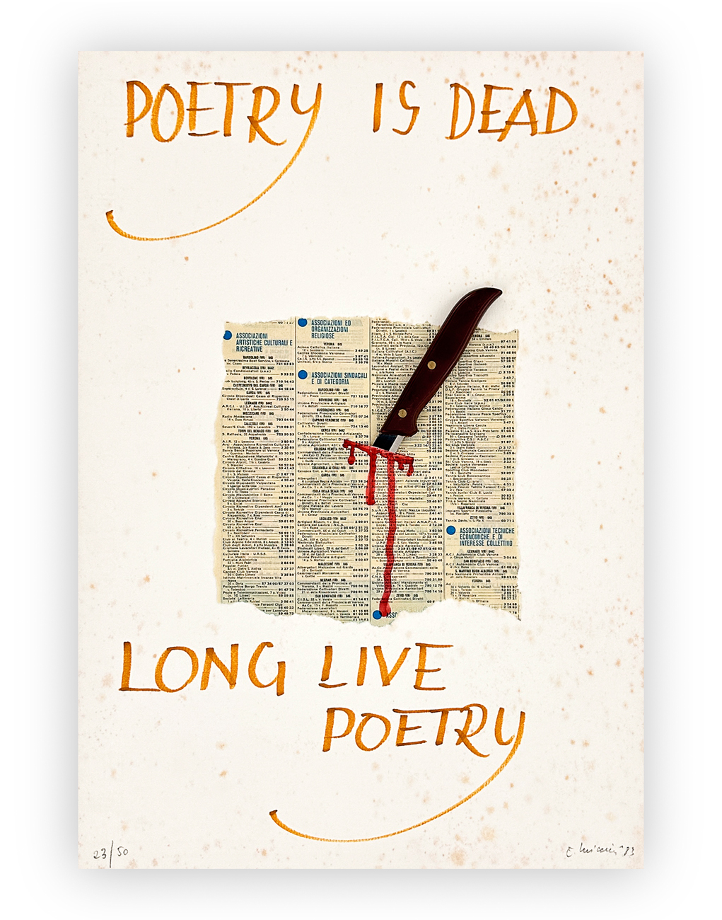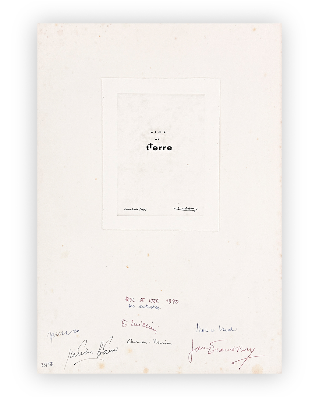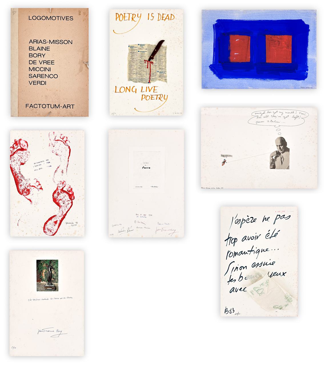Cartella contenente 7 multipli di Arias-Misson, Blaine, Bory, De Vree, Miccini, Sarenco e Verdi, ciascuno recante firma e numerazione (Esemplari 23/50) al fronte