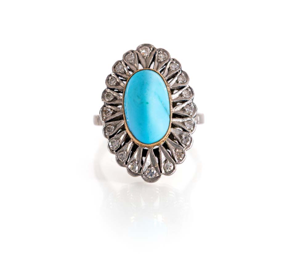 Anello in oro, turchese e diamanti Oro bianco 750/000. Peso complessivo gr....