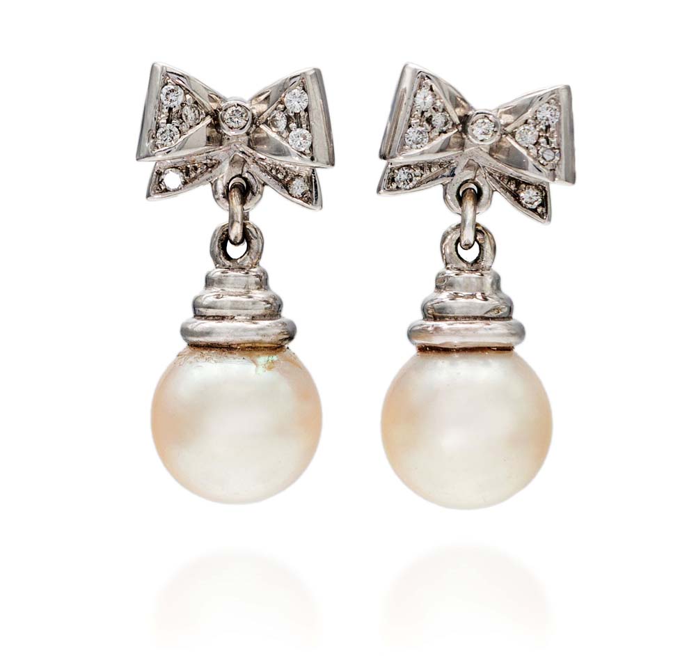 Coppia di orecchini pendenti in oro, perle e brillanti. Oro bianco 750/000....