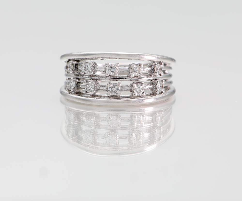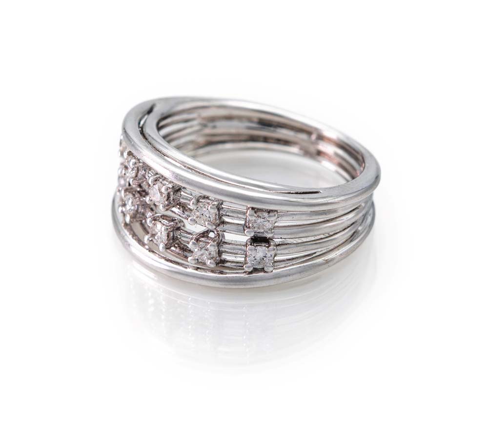 Anello a fascia in oro e brillanti Oro bianco 750/000. Peso complessivo gr. 6,60. Misura 13