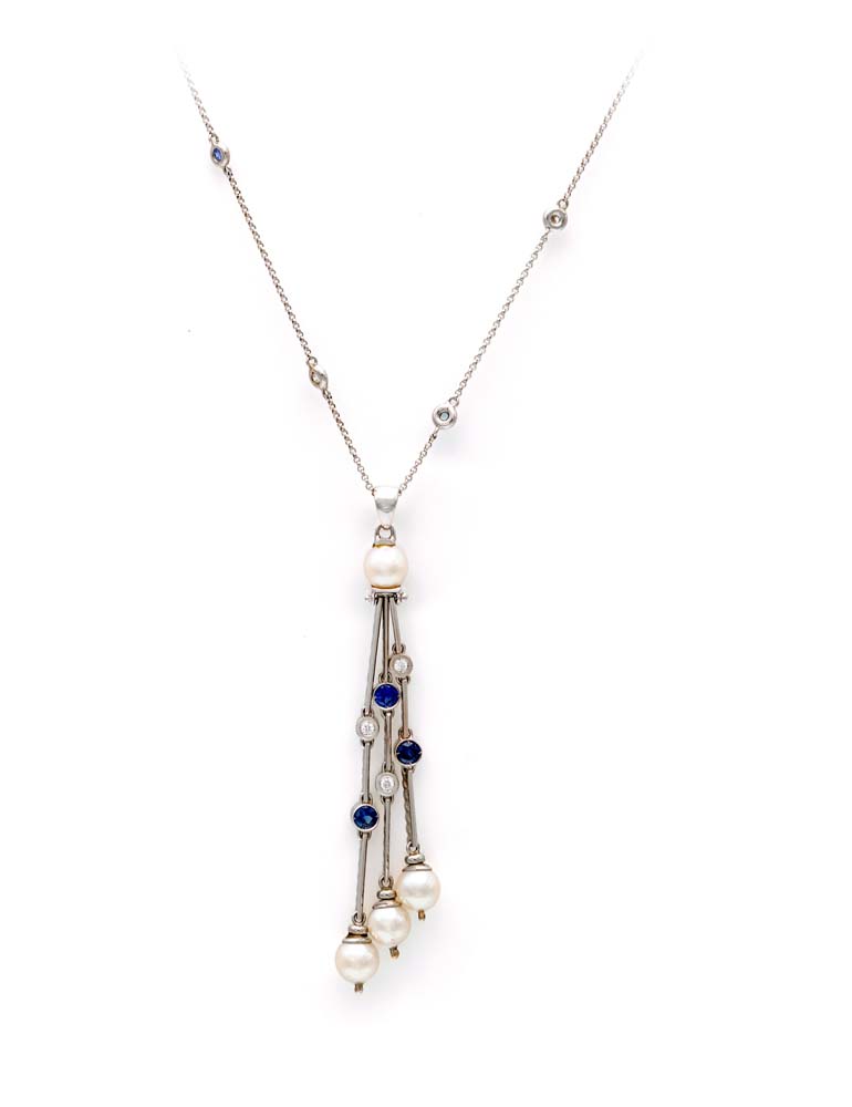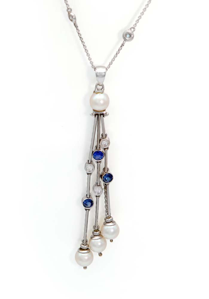 Pendente in oro, perle, zaffiri e brillanti. Oro bianco 750/000. Diamanti in taglio rotondo e zaffiri in taglio rotondo. Perle da coltivazione mm. 6. Peso complessivo gr. 16 Lunghezza catena cm 45, pendente cm 9