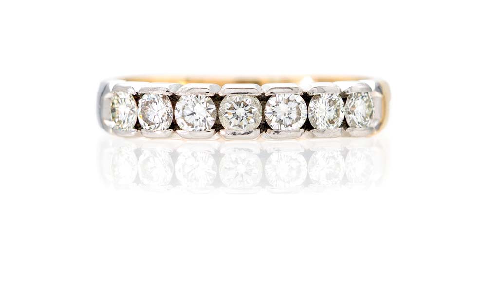 Anello a riviera in oro e brillanti Oro bianco e giallo 585/000. Diamanti in taglio rotondo brillante ct. 0, 55 ca. Misura 12