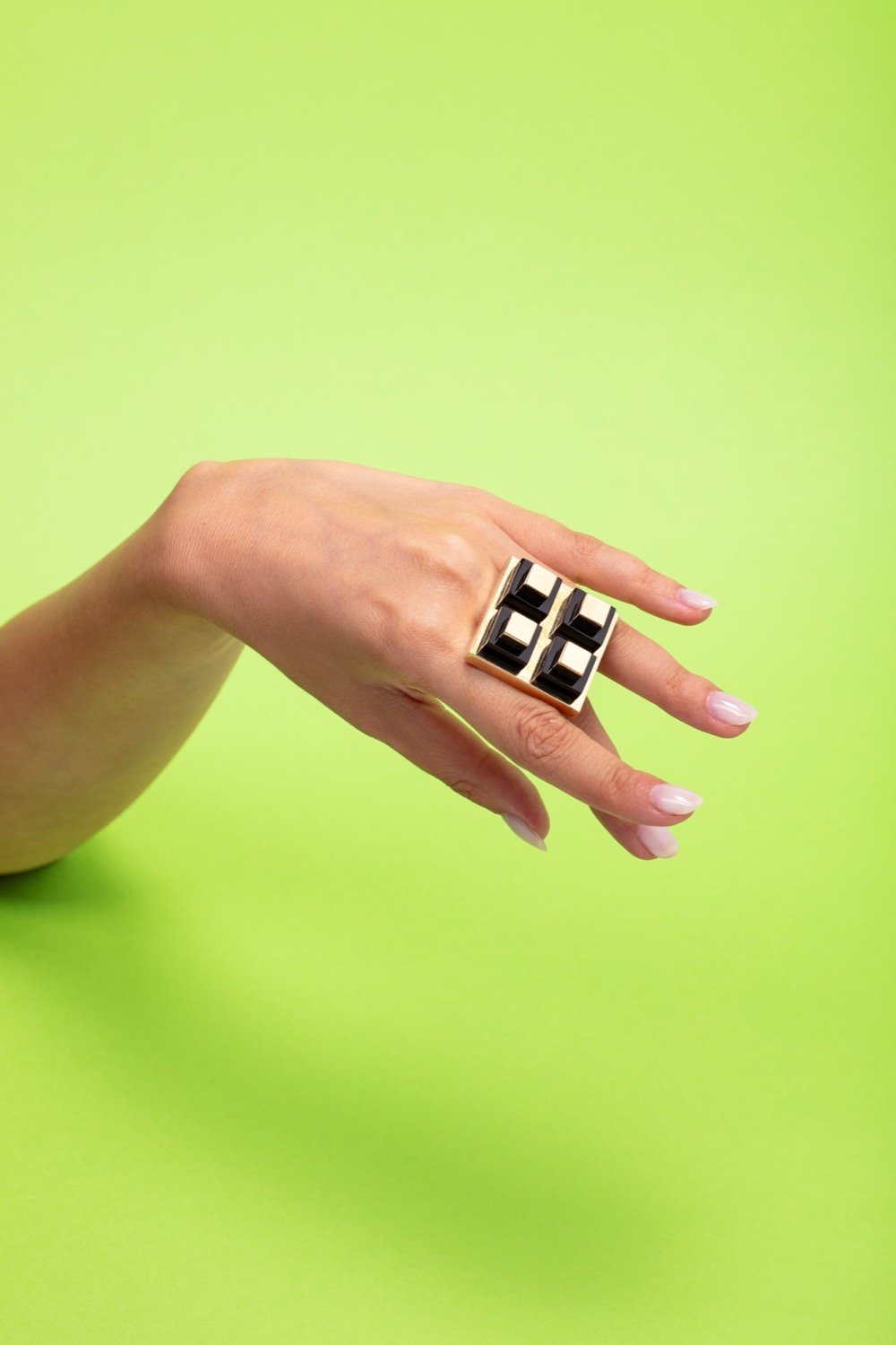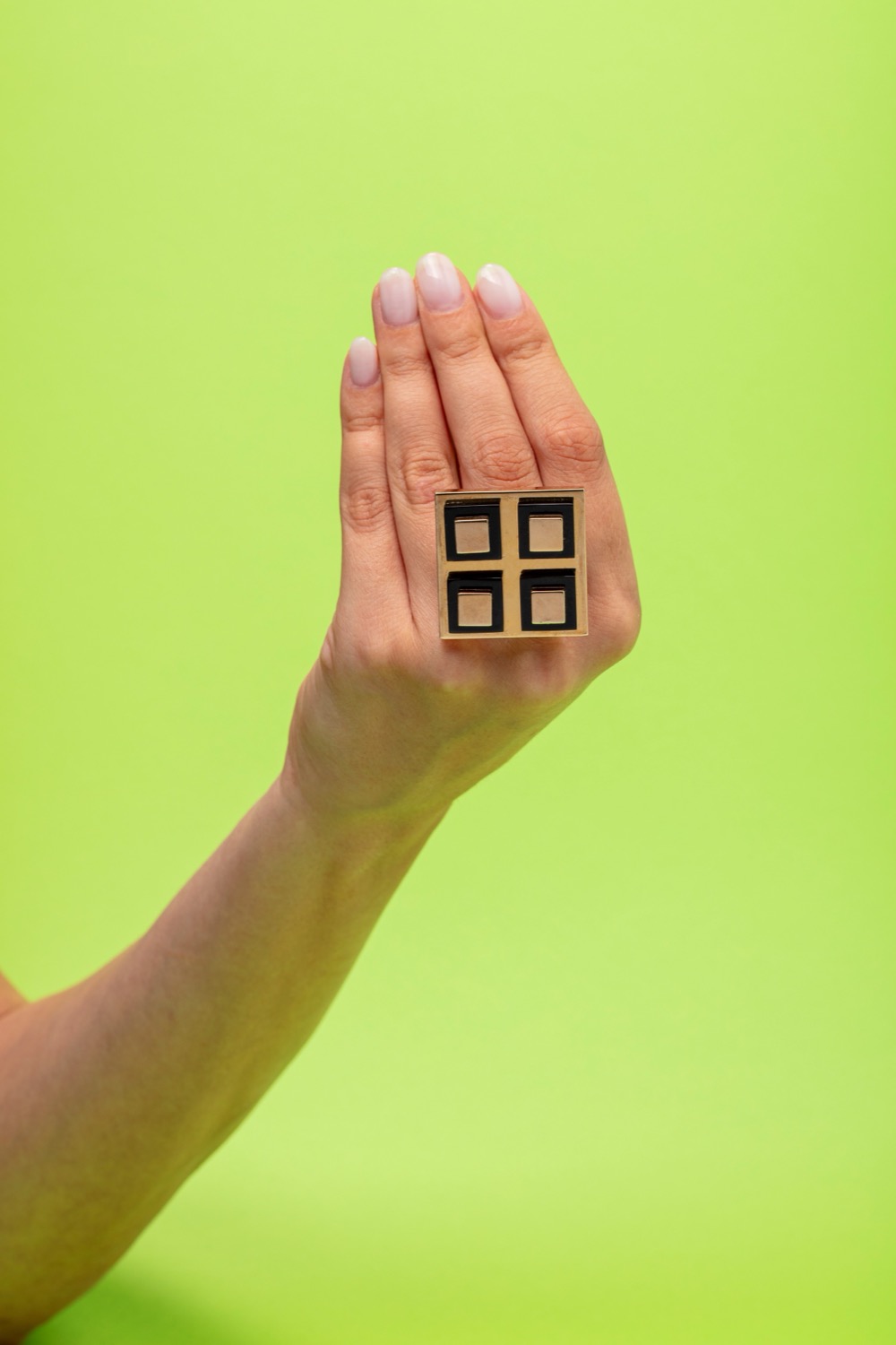 dorato, di forma quadrata con quattro elementi in onice, firmato e punzonato, difetti (lieve ammaccatura su un lato di un cubo).