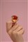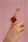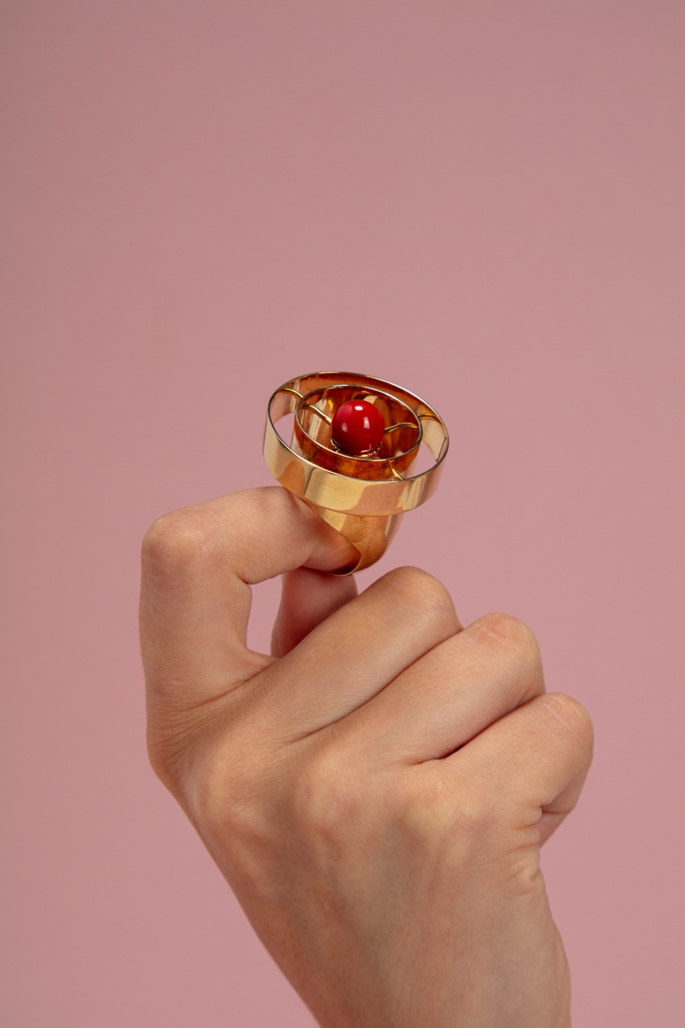 dorato, di forma circolare con al centro sfera in pasta di corallo rosso, firmato e punzonato.