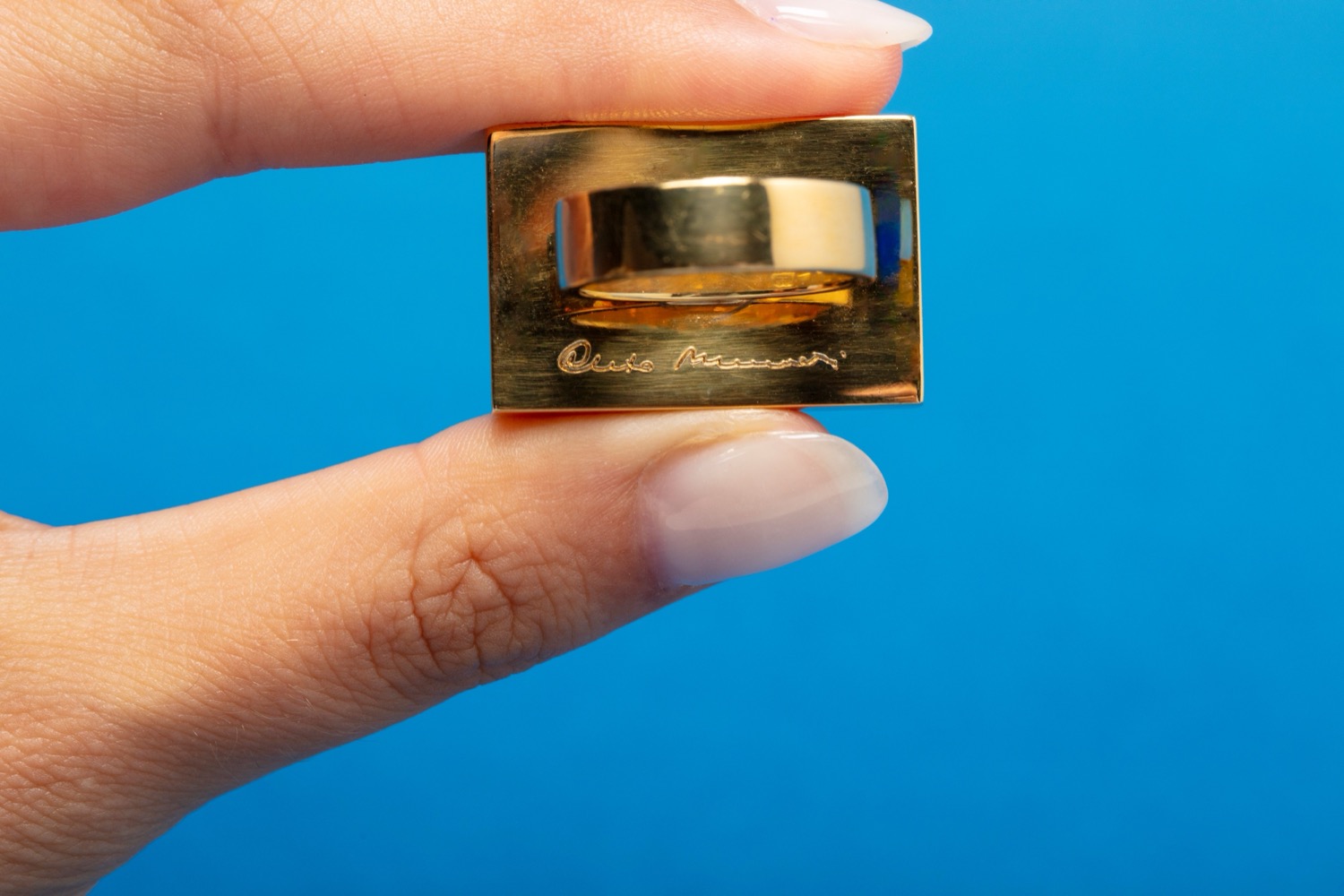 dorato, con mani che trattengono cilindro in onice, firmato e punzonato.