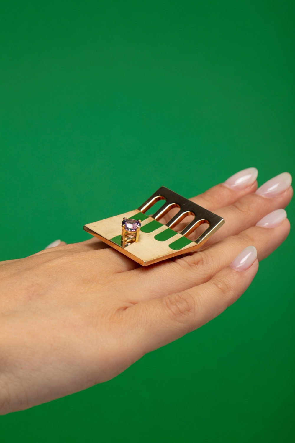 dorato, con archi lucidi e satinati, pietra viola rotonda sfaccettata, firmato e punzonato.