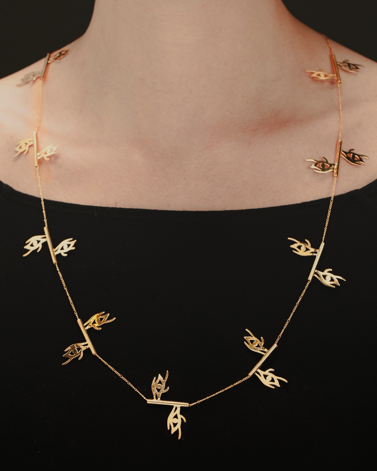 dorata, con elementi a occhi di Horus, firmata e punzonata, difetti (un elemento mancante).