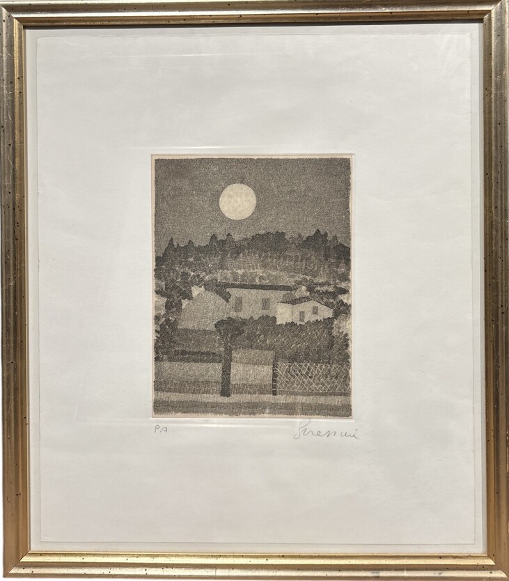 "Paesaggio in notturna", es. "P.A", 42 x 36 cm, firma indistinta in basso a destra. In cornice.