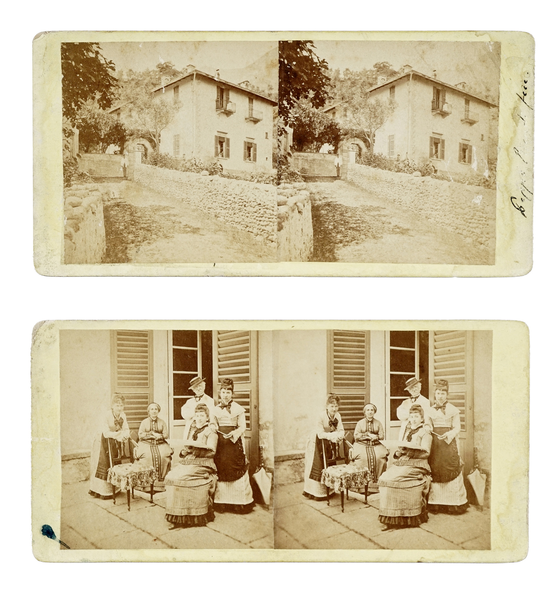 Dimensioni 175x85 mm ca. (65) I tre dagherrotipi stereoscopici, in ottimo stato, ritraggono ragazze parzialmente o totalmente svestite. Due delle fotografie stereoscopiche sono datate 1878 e firmate da Pippo Ricordi, fratello di Giulio: la prima ritrae cinque persone, tra le quali pare di vedere (la bassa risoluzione non dà certezze) Giuseppe Verdi, Barberina Strepponi (sorella di Giuseppina) e Maria Carrara Verdi, forse a Villa Ricordi – la seconda ritrae villa Riva a Griante (CO), molto vicina a Villa Ricordi. Le altre fotografie stereoscopiche hanno per soggetto: n.12 modelle (quasi tutte con stampigliature francesi), tra cui quattro nudi femminili (alcune con il nome di battesimo scritto sul retro); n.14 vedute di Parigi (tra le quali spicca Notre Dame senza la guglia centrale, quindi ante 1858) e di altre località francesi (Versailles, Nice, Fontainebleau ecc.); n.18 vedute del lago di Como e dintorni; n.5 immagini di soggetti vari; n.13 (di cui due con stampigliatura G. Sommer – Napoli) vedute di città italiane, tra cui Roma, Napoli e Venezia. Nel lotto anche un visore stereoscopico (con alcuni difetti).