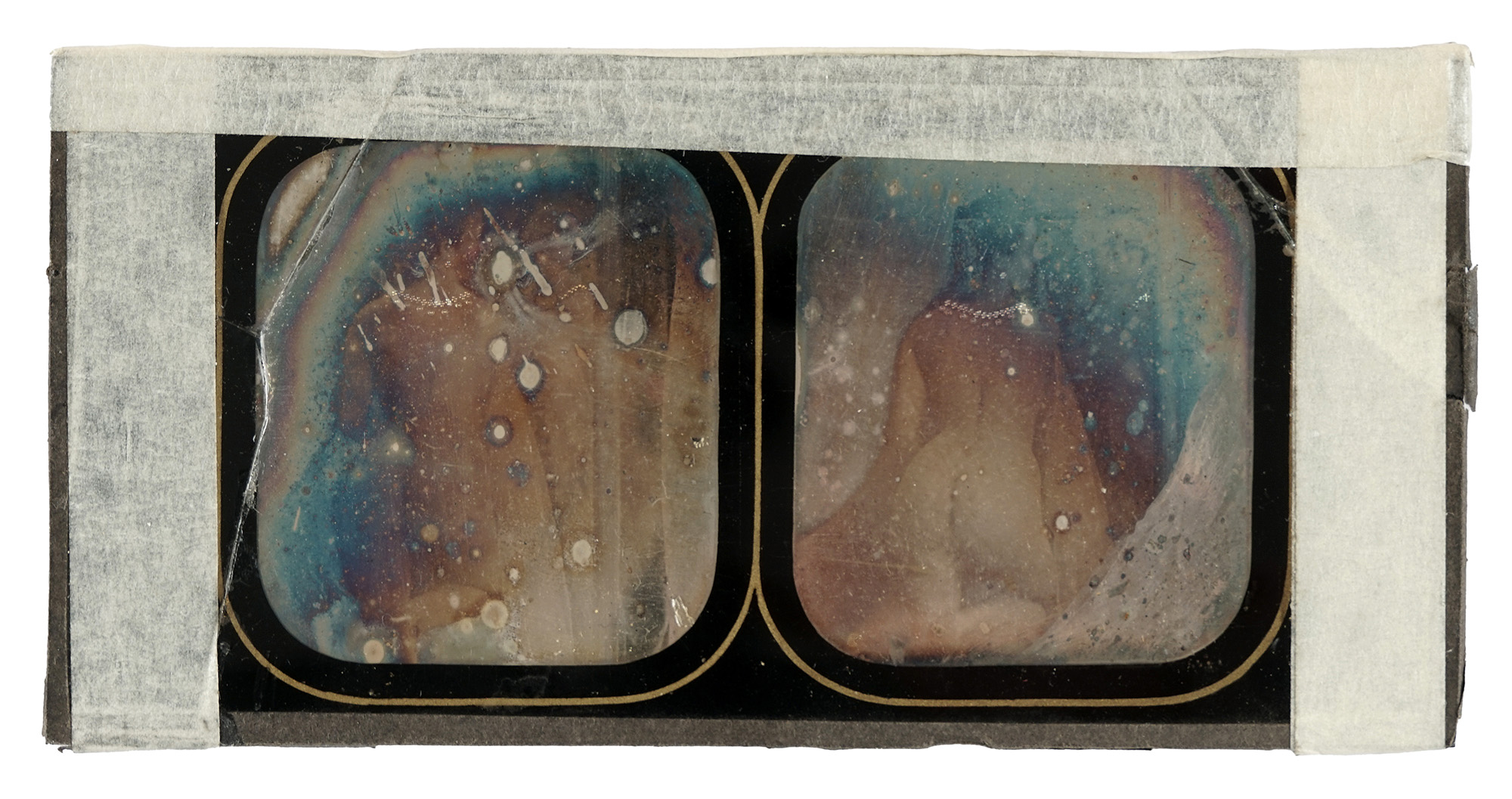 Raccolta di 64 fotografie stereoscopiche in b/n o colorate e 3 dagherrotipi stereoscopici colorati, su vetro con carta nera di fondo. Fine XIX secolo e precedenti.