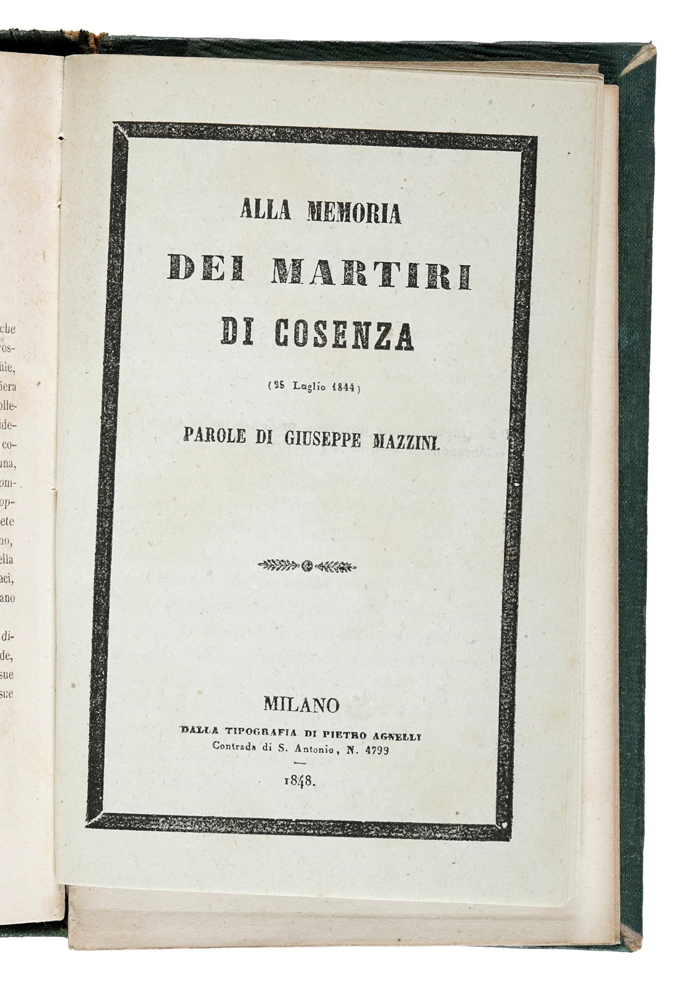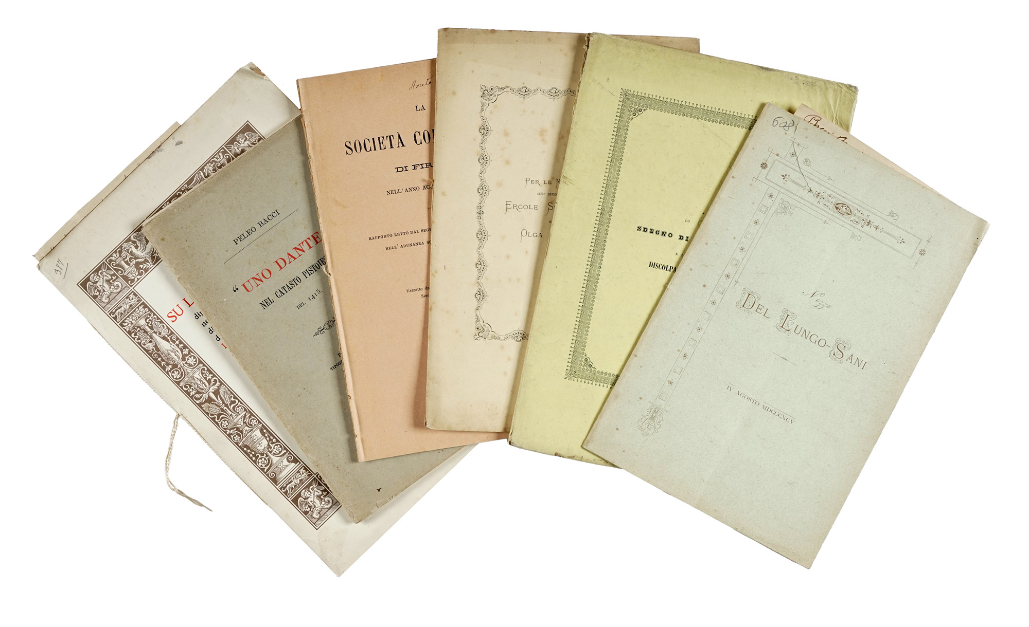 La raccolta contiene: Ricciardi G. Alla Santa Memoria di Attilio ed Emilio Bandiera, Domenico Moro, Niccolò Ricciotti [...]. Parigi, 1844. Unito con: Mazzini, Giuseppe. Ricordi dei Fratelli Bandiera. Parigi, 1844. Unito con: Mazzini, Giuseppe. Alla memoria dei martiri di Cosenza (25 luglio 1844). Milano, 1848 - Settembrini, Luigi. Difesa di Luigi Settembrini scritta per gli uomini di buon senso, dedicata alla G. Corte Criminale di Napoli. Firenze, 1850 - Morale cattolica. Osservazioni di Alessandro Manzoni, Prato, Guasti 1834 - Locandine, manifesti, volantini di propaganda politica e dei fasci dei lavoratori. Anni 1918-1919. Per un totale di 15 fogli - Pellegrini Astorre. Autografi di Champollion a Firenze. Roma, 1903. Estratto - Livi Giovanni. La patria e la famiglia di Girolamo Marini ingegnere militare del secolo XVI. Bologna, 1901 - Costa, Emilio. Nuovi documenti intorno a Pietro Pomponazzi. Bologna, 1903 - Bargensis, Antonii. Chronicon Montis Oliveti (1313-1450). Firenze, 1901 - Frenes, A. Jean-Pierre Vieusseux d'après sa correspondance avec De Sismondi. Roma, 1888. Estratto - Manoscritto dal titolo Ristretto di materia medica libro 1° - Polli Giovanni. Dello stato della fibrina del sangue nelle infiammazioni. Milano, 1845 - Foresi, Alessandro. Uova di Pasqua offerte ai signori Cavalcaselle, Milanesi, Gamurrini e Mayer. Uno scarabeo parlante. Firenze, 1873 - Orlandini F.S. Del Galileo e della Madre Educatrice del prof. scultore Emilio Demi di Livorno. Livorno, 1838 - L'industriale dell'Emilia-Romagna. Anno I° n. 8 e n. 9, marzo ed aprile 1857. Rocca S. Casciano, 1857 - Le riviste del Vieusseux. Testi di Ferrata, Dal Pane, Salvatorelli e Grazzini. Firenze, Vallecchi, 1960 - Schicchi, Paolo. Le degenerazioni dell'anarchismo. Parte I^: mentecatti e delinquenti. La Spezia, Tip. Sociale, 1909. Contiene anche un foglio volante che costituisce l'appendice alla parte 1° - Camerino Aldo. Poesie. A cura di Carlo della Corte e Ugo Fasolo. Pref. di Luigi Baldacci. Vicenza, Neri Pozza, 1977. Prima edizione - Lettere inedite di scrittori liguri del secolo XIX pubblicate da Stefano Grosso. Opuscolo per le nozze Enrichetta Virgili-Guido Guidotti, Firenze, 1897 - Maiocchi r. - Moiraghi a. Gli affreschi di Cesare Nebbia e di Federico Zuccari nell'Almo Collegio Borromeo di Pavia. Pavia, 1908. Bella pubblicazione in 4° grande per le nozze Jacini - Borromeo. Milano, 7 gennaio 1909 - Nuptialia. Valentinis, Augusto. Antichità Altinati. Elegante pubblicazione in-folio per le nozze Canossa-Reali, Lucheschi-Reali. Saggio relativo al sito archeologico di Altino lungo le rive del Sile, territorio veneto. Numerose tavv. f.t. in fine. Venezia, 1893 - Insieme di 36 opuscoli per nozze pubblicati tra la seconda metà dell'800 e i primi decenni del 900 - 3 fascicoli de L'autonomia scientifica di A. Bertini Calosso. Genova, Formiggini 1912 - 14 opuscoli tutti con dedica autografa dei singoli autori a Bartolomeo Podestà bibliotecario della Biblioteca Nazionale di Firenze - Altri 10 opuscoli vari. (100)