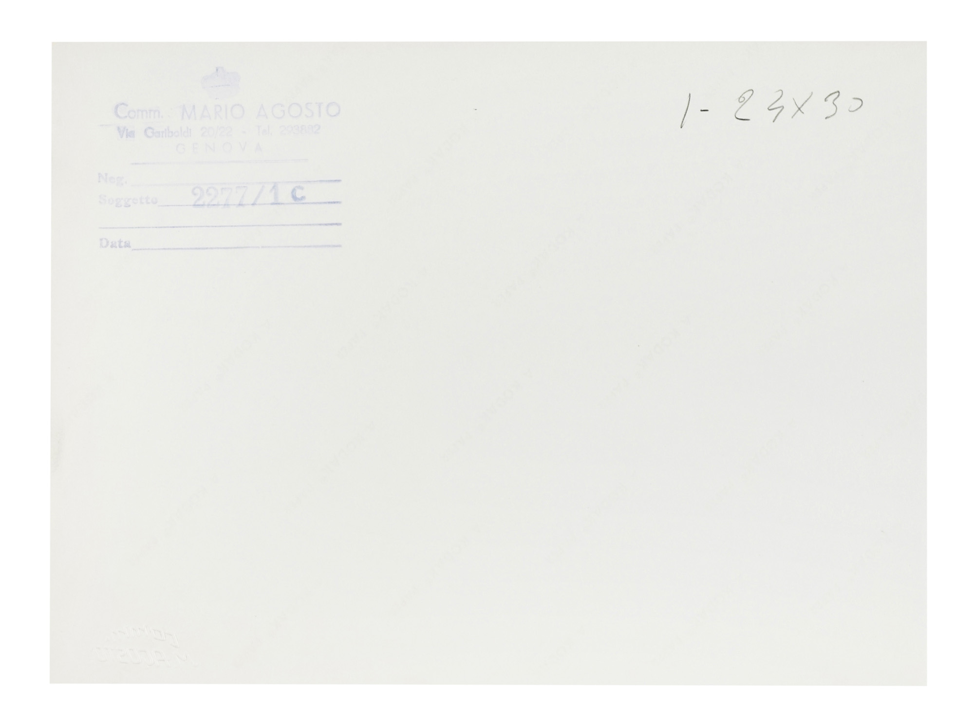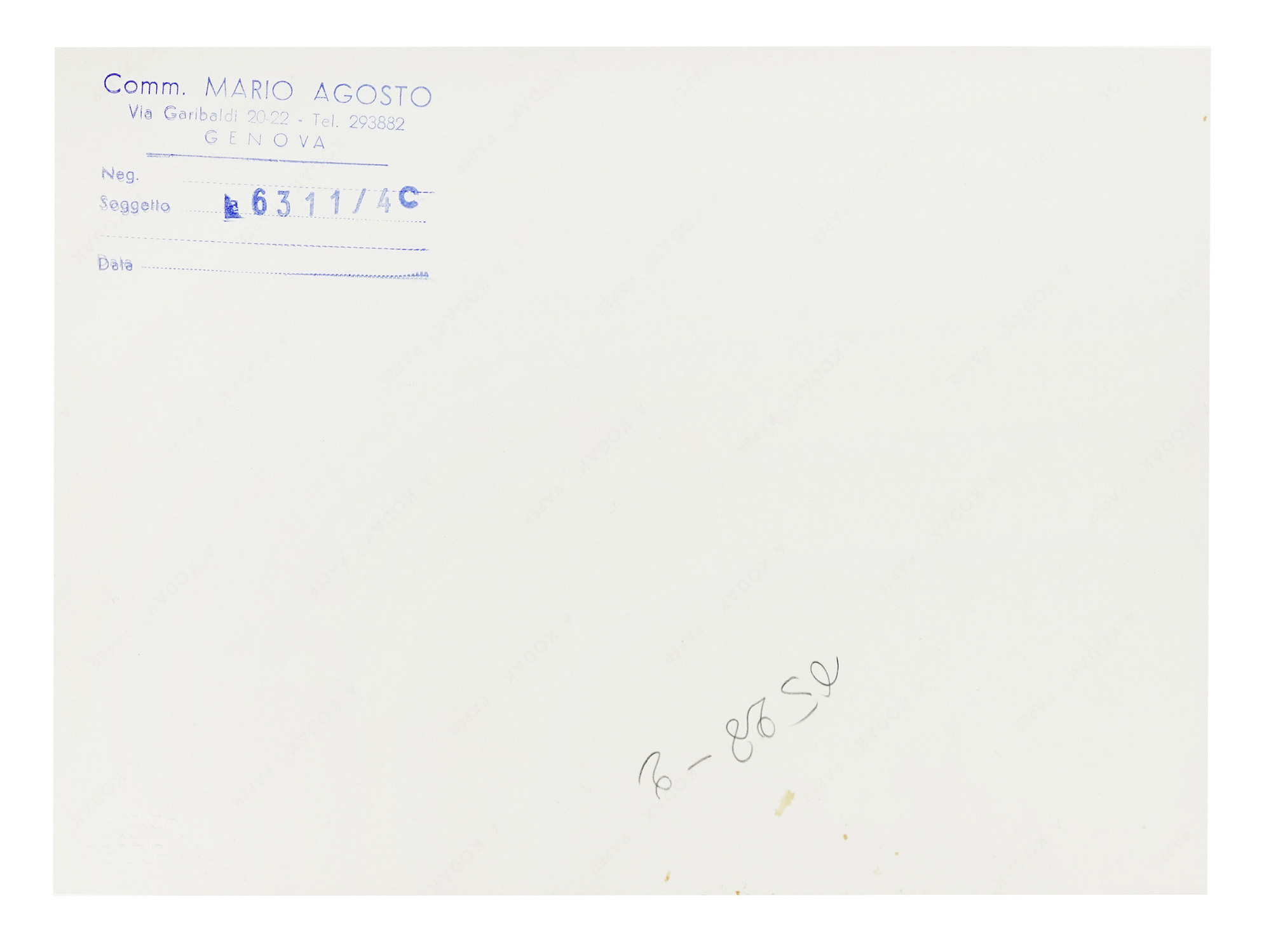 Album con 30 fotografie a colori, 5 diapositive a colori (senza telai) e 5 negativi in b/n e 1 a colori di transatlantici in navigazione, o in porto, e dei loro interni, insieme ad alcune di altro genere. Gli scatti professionali sono del fotografo genovese Mario Agosto, come da stampigliature. Perfette condizioni. Dimensioni foto 180x240 mm. (1) Le fotografie ritraggono: la t/n Raffello (due diapositive notturne 95x60 mm della nave e due delle cabine, oltre a 5 negativi b/n 120x95 mm della Raffaello in navigazione); la nave Angelina Lauro (tre foto: il comignolo, la piscina e un'immagine notturna); la t/n Eugenio C (due foto in porto e una della piscina); una nave tedesca di prua in bacino di carenaggio (1 foto); gli interni di alcune navi in tipico stile anni '60: saloni, cinema, ristoranti, bar, chiesa, plancia di comando, cabine, corridoi, sale TV ecc. (15 foto). Altre 3 foto ritraggono un motoryacht tipo Admiral (anni '60) in navigazione; 1 foto, uno dei primi Saloni Nautici Internazionali di Genova; 3 foto e una diapositiva, un'esposizione floreale; 1 foto, con il suo negativo, la Lanterna di Genova vista dall'alto all'epoca.