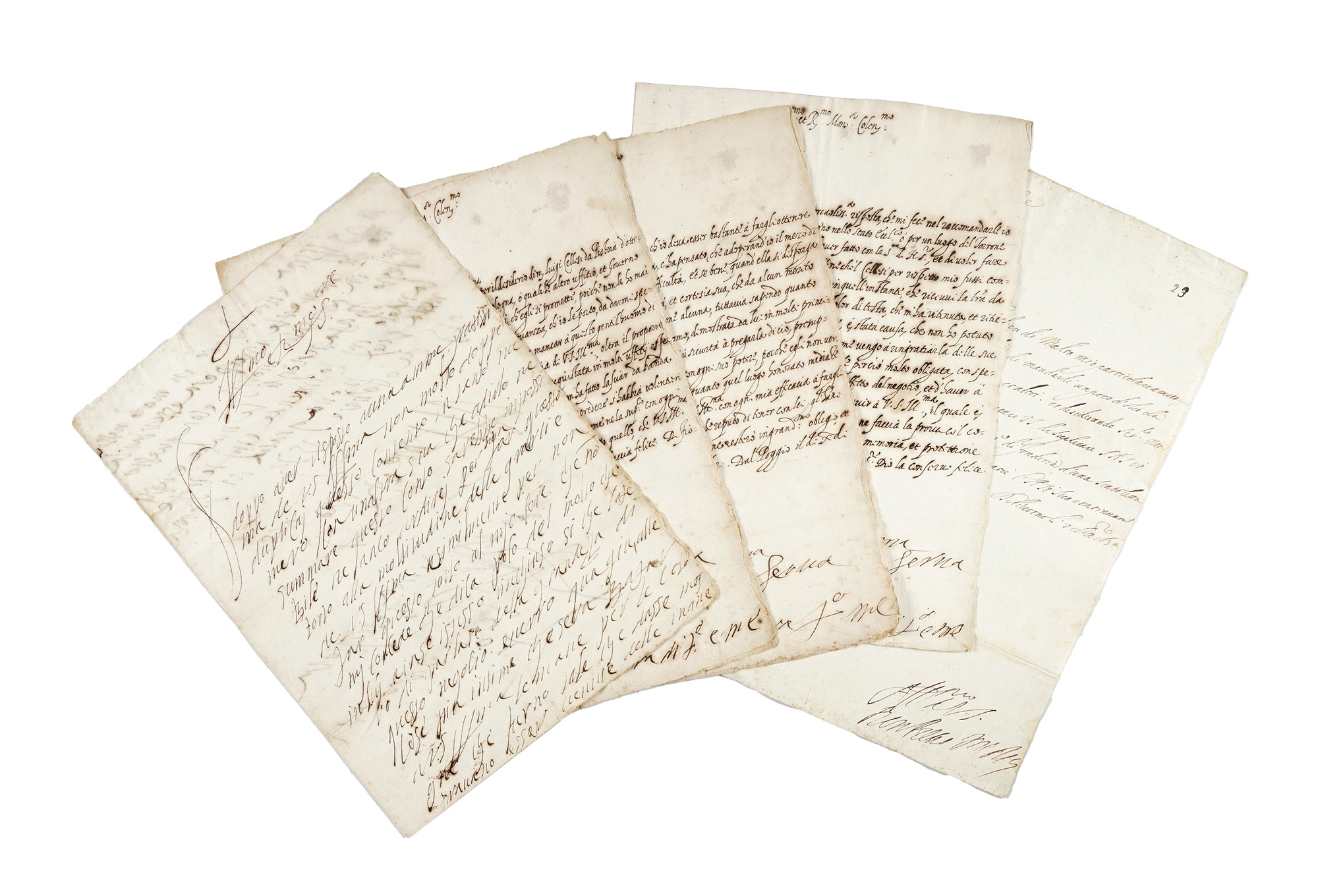Manoscritti a inchiostro bruno. 4 bifoli filigranati. Scritte 5 pagine in totale. Dimensioni: 210x275 mm. SI AGGIUNGE: Pietro de' Medici (1592-1654) [Cavaliere di Malta e Governatore di Livorno]. Lettera con firma autografa. Datata Livorno 1634. Un bifolio a inchiostro bruno. Dovendo inviare a Malta un poco d'olio di stomacho, Pietro richiede una scatoletta di fonderia. (5) Eleonora – Dianora - di Toledo (1553-1576) venne strangolata nel 1576 dal marito Pietro de' Medici: aveva ventitré anni. Il femminicidio fu insabbiato, ma causò forti attriti tra Firenze e la corte spagnola. La sua vicenda, a lungo dimenticata, venne riscoperta grazie all'interesse, in ambito accademico, per la cugina Isabella de' Medici, con la quale Leonora condivise non solo alcuni aspetti della vita, ma anche la morte. Oggi la sua storia è considerata uno dei punti di riferimento per comprendere la vita delle donne nelle corti italiane nel Rinascimento. Lettera datata di Fiorenza [...] ottobre 1573: E doppo aver risposto auna gratissima de V.S.Ill.ma non molto doppo duplicai questo Contento in tanto numero con unaltra sua che adirlo ne summare questo Conto sarebbe impossibile, ne anco ardirej per non far torto alla moltitudine delle grazzie de V.S.Ill.ma [...] laprego di parlare della grandezza di questo negozio e verro quagiu alle cose più intime che sera Bazar[?] a V.S.Ill.ma [...] enon lasero in modo nessuno di metterle in opera esserbarla poi in articulu mortis [...] Leonora di To. Lettera datata di Fiorenza [...] sittimbre 1574: Conosco che l'usar l'intercession' mia apprisso V.S.Ill.ma per il disiderio di ms Luigi Cellisi da Pistoia d'ottener còl favor di quilla l'Auditorato del Torron' di Bologna [tribunale penale], ò qualesi' altro uffico, et Governo nello stato Eccles.co: non potrà errer forsi di quell'autorità, ch'egli si promettì [...] Leonora di To. Lettera datata di Fiorenza [...] ott.re 1574: Stesso argomento (raccomandazione Cellisi). Lettera datata dal Poggio [...] nov.re 1575: Ha tanta confidenza in ms Luigi Cellisi Dottor di ligge, ch'io dicca essir bastanti à fargli ottinire à questa volta, un luogo nella Ruota di Bologna, ch'ha pensato, che adoprand'io il mezzo di V.S.Ill.ma di nuovo, non dovirsi haver punta di difficultà [...] Leonora di To.