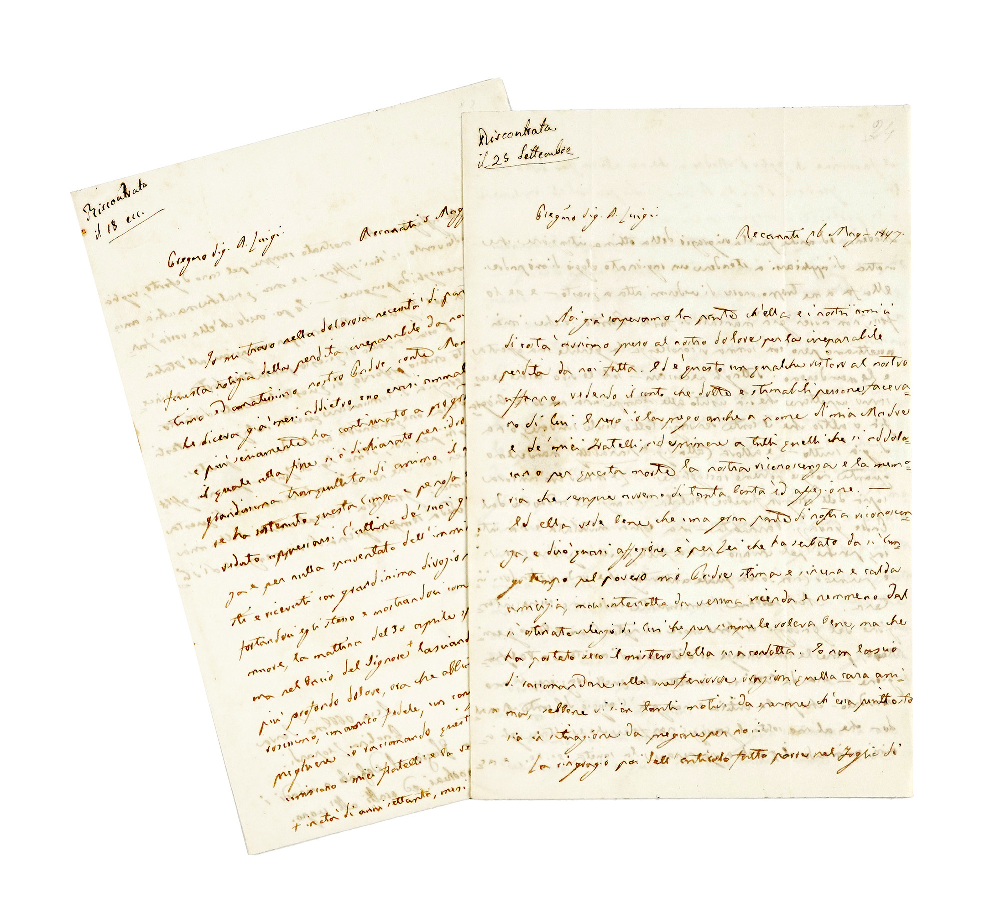 Manoscritti a inchiostro bruno. 2 bifoli, scritte 7 pagg. In testa ai documenti, note di riscontro del destinatario. Lettere piegate in forma di busta, con indirizzo autografo e timbri postali al verso. Conservate tracce di sigilli in ceralacca nera, a lutto. Dimensioni 135x210 mm. (2) Lettera datata 5 maggio. Io mi trovo nella dolorosa necessità di parteciparle l'infausta notizia della perdita irreparabile da noi fatta dell'ottimo ed amatissimo Padre, conte Monaldo. Come io le diceva già mesi addietro esso erasi ammalato seriamente, e più seriamente ha continuato a progredire il suo male il quale alla fine si è dichiarato per idrope generale [...] Mostrando come coraggiosamente si muore, la mattina del 30 aprile spirò placidamente l'anima nel bacio del Signore lasciando tutti noi immersi nel più profondo dolore [...] in età di anni settanta, mesi otto e giorni 15 [...]. Lettera datata 16 maggio. Noi già sapevamo la parte ch'ella e i nostri amici di costà avvieno preso al nostro dolore per la irreparabile perdita da noi fatta. Ed è questo un grande ristoro al nostro affanno, vedendo il conto che dotte e stimabili persone facevano di lui [...] io la prego anche a nome di mia Madre e de' miei fratelli, ad esprimere a tutti quelli che si addolorano per questa morte la nostra riconoscenza [...] Ed ella vede bene che una gran parte di nostra riconoscenza, e dirò quasi affezione, è per lei che ha serbato da sì lungo tempo pel povero nostro Padre stima e sincera e calda amicizia, mai interrotta da veruna vicenda e nemmeno dal sì ostinato silenzio di lui che pur sempre le voleva bene, ma che ha portato seco il mistero della sua condotta [evidentemente Monaldo non si era confessato con don Palmieri in punto di morte]. La lettera prosegue con accenni ad un articolo sul Foglio di Modena in memoria del defunto, e al controverso matrimonio del fratello Pier Francesco.
