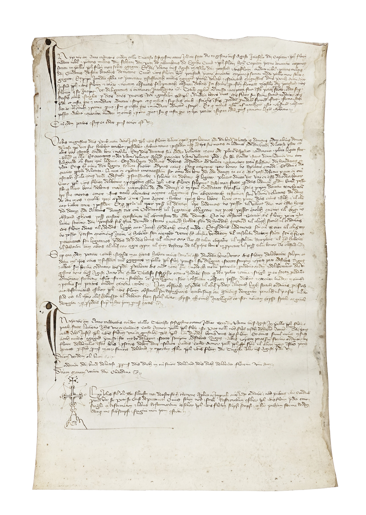 Manoscritto pergamenaceo a inchiostro bruno. Con signum tabellionis. Buona conservazione. Dimensioni: 545x350 mm. (1) Atto notarile di ambito fiorentino. [...] Die trigesimo mensis Agusti In consilio domini Capitani cum populi florentini mandato nobil cum potentis militis domini Feltrari domini petri de accorambonis de Egubio [...]. Pietro Accoramboni da Gubbio, era fratello di Gaddo e Oderighello di Accorombone. La famiglia, originaria di Gubbio, si diramò a Roma, Firenze e in Sicilia. Un esponente della famiglia, Accorimbono II di Giovanni, fu podestà di Firenze nel 1324, 1326, 1336 e, per breve tempo, anche signore di Tolentino. Qui venne ucciso nel 1340. Nell'atto è nominato un pallio, il popolo di Firenze, beni mobili e immobili, il notaro Pietro Nolli.
